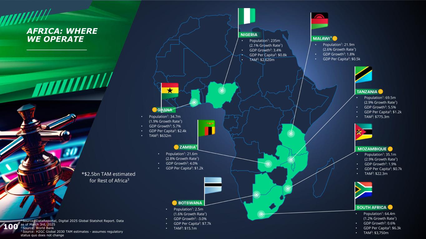 100 AFRICA: WHERE WE OPERATE • Population1: 2.5m (1.6% Growth Rate1) • GDP Growth2: -3.0% • GDP Per Capita2: $7.7k • TAM3: $15.1m 1 Source: DataReportal, Digital 2025 Global Statshot Report. Data as of March 3rd, 2025 2 Source: World Bank 3 Source: H2GC Global 2030 TAM estimates - assumes regulatory status quo does not change • Population1: 21.6m (2.8% Growth Rate1) • GDP Growth2: 4.0% • GDP Per Capita2: $1.2k • Population1: 34.7m (1.9% Growth Rate1) • GDP Growth2: 5.7% • GDP Per Capita2: $2.4k • TAM3: $632m • Population1: 21.9m (2.6% Growth Rate1) • GDP Growth2: 1.8% • GDP Per Capita2: $0.5k • Population1: 235m (2.1% Growth Rate1) • GDP Growth2: 3.4% • GDP Per Capita2: $0.8k • TAM3: $2,620m • Population1: 69.5m (2.9% Growth Rate1) • GDP Growth2: 5.5% • GDP Per Capita2: $1.2k • TAM3: $775.3m • Population1: 35.1m (2.9% Growth Rate1) • GDP Growth2: 1.9% • GDP Per Capita2: $0.7k • TAM3: $22.3m • Population1: 64.4m (1.2% Growth Rate1) • GDP Growth2: 0.6% • GDP Per Capita2: $6.3k • TAM3: $3,750m * * *$2.5bn TAM estimated for Rest of Africa3