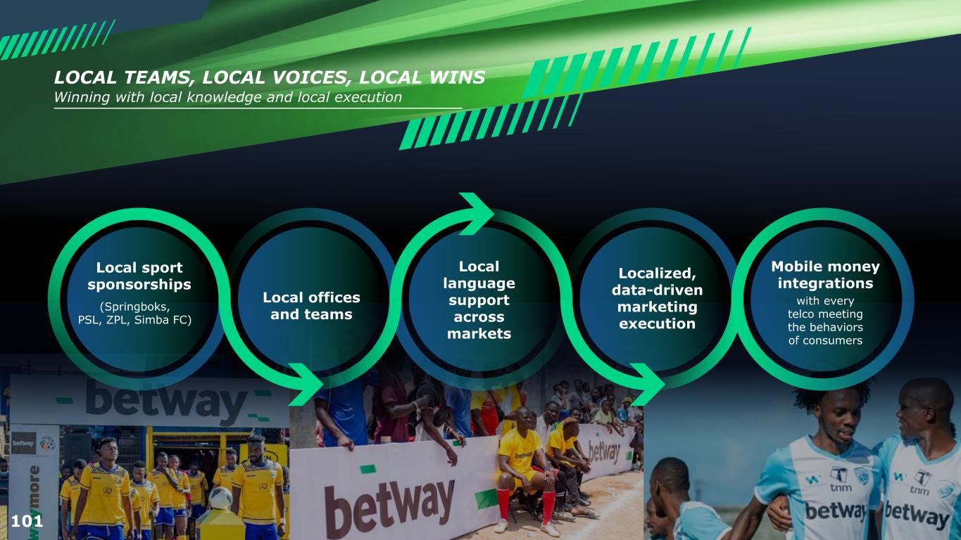 101 LOCAL TEAMS, LOCAL VOICES, LOCAL WINS Local language support across markets Localized, data-driven marketing execution Mobile money integrations Local offices and teams Local sport sponsorships with every telco meeting the behaviors of consumers (Springboks, PSL, ZPL, Simba FC) Winning with local knowledge and local execution