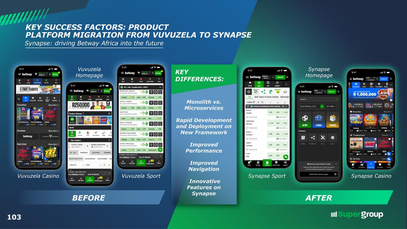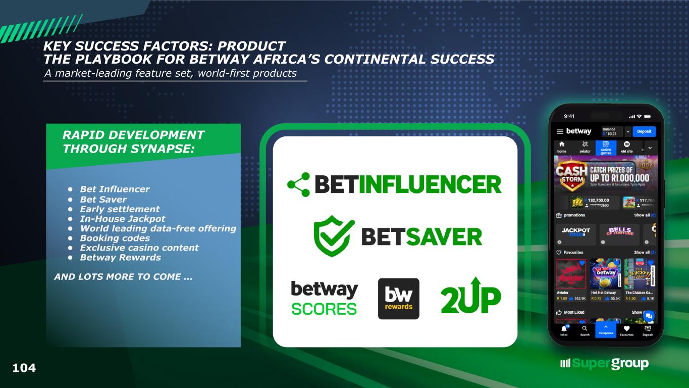 103 KEY SUCCESS FACTORS: PRODUCT PLATFORM MIGRATION FROM VUVUZELA TO SYNAPSE Synapse: driving Betway Africa into the future KEY DIFFERENCES: Vuvuzela Homepage Vuvuzela Casino Vuvuzela Sport Synapse Homepage Synapse Sport Synapse Casino Monolith vs. Microservices Rapid Development and Deployment on New Framework Improved Performance Improved Navigation Innovative Features on Synapse BEFORE AFTER