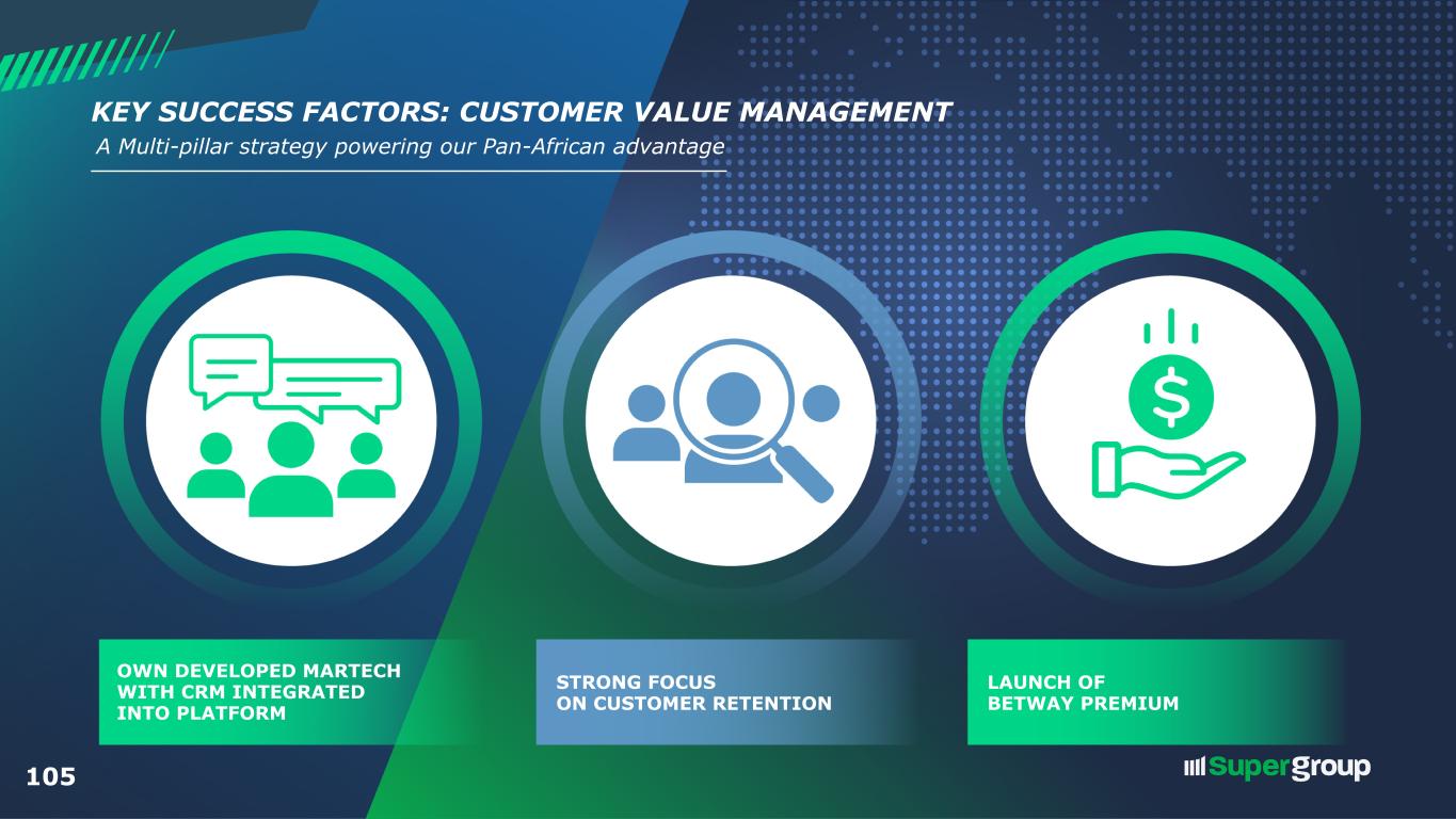 A market-leading feature set, world-first products 104 • Bet Influencer • Bet Saver • Early settlement • In-House Jackpot • World leading data-free offering • Booking codes • Exclusive casino content • Betway Rewards AND LOTS MORE TO COME ... RAPID DEVELOPMENT THROUGH SYNAPSE: KEY SUCCESS FACTORS: PRODUCT THE PLAYBOOK FOR BETWAY AFRICA’S CONTINENTAL SUCCESS