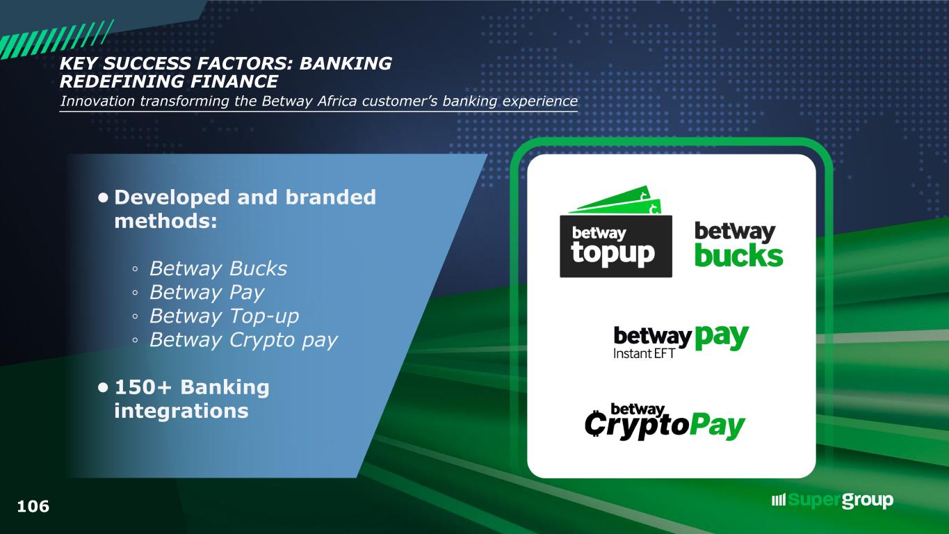 106 KEY SUCCESS FACTORS: BANKING REDEFINING FINANCE Innovation transforming the Betway Africa customer’s banking experience • Developed and branded methods: ◦ Betway Bucks ◦ Betway Pay ◦ Betway Top-up ◦ Betway Crypto pay • 150+ Banking integrations