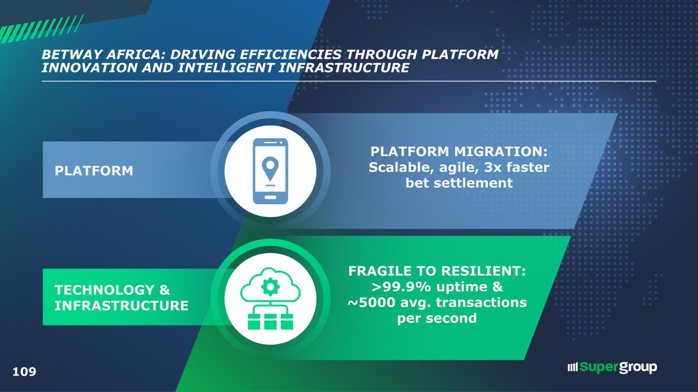 BETWAY AFRICA: DRIVING EFFICIENCIES THROUGH PLATFORM INNOVATION AND INTELLIGENT INFRASTRUCTURE 109 PLATFORM TECHNOLOGY & INFRASTRUCTURE PLATFORM MIGRATION: Scalable, agile, 3x faster bet settlement FRAGILE TO RESILIENT: >99.9% uptime & ~5000 avg. transactions per second