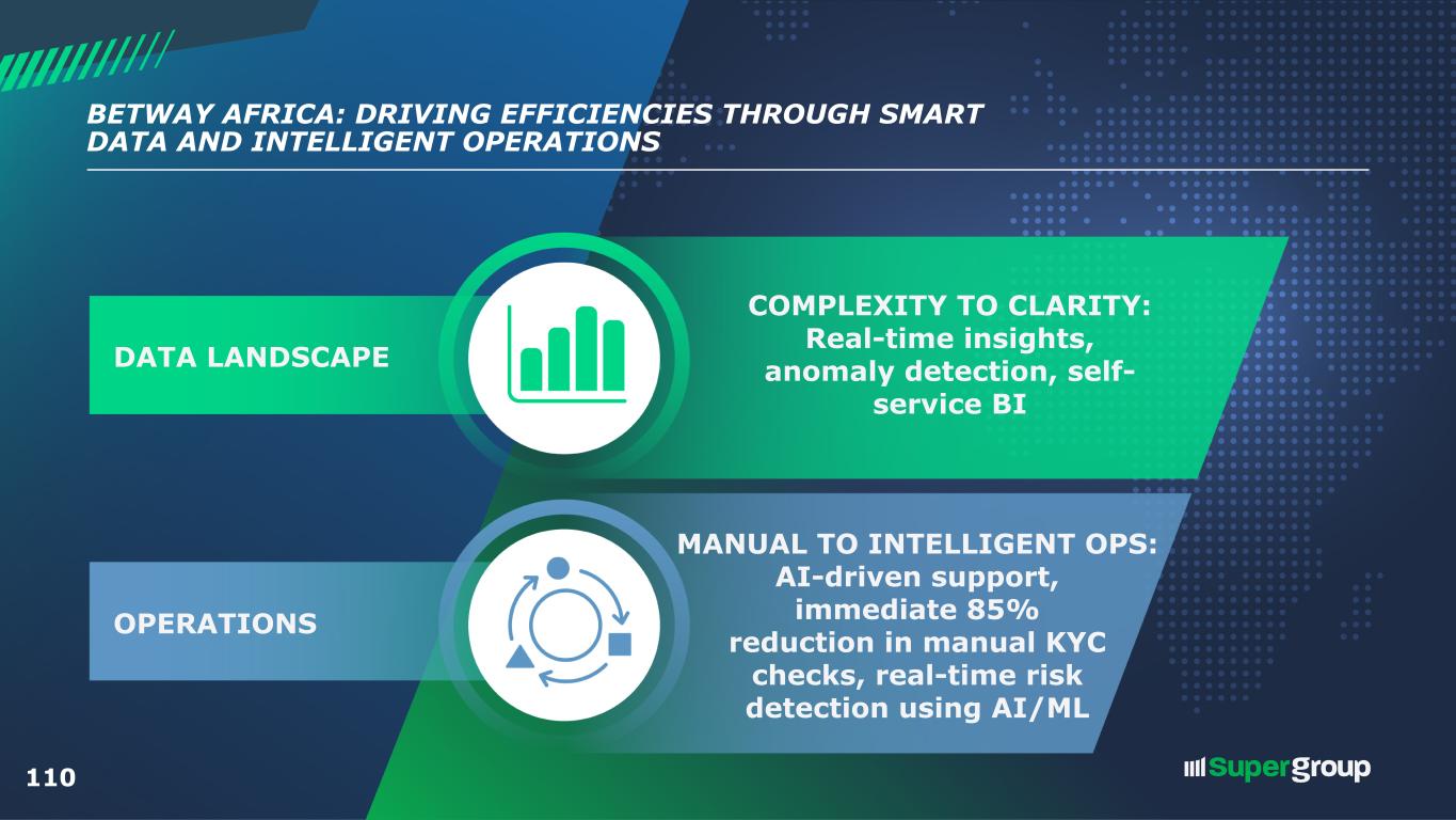110 BETWAY AFRICA: DRIVING EFFICIENCIES THROUGH SMART DATA AND INTELLIGENT OPERATIONS DATA LANDSCAPE OPERATIONS COMPLEXITY TO CLARITY: Real-time insights, anomaly detection, self- service BI MANUAL TO INTELLIGENT OPS: AI-driven support, immediate 85% reduction in manual KYC checks, real-time risk detection using AI/ML