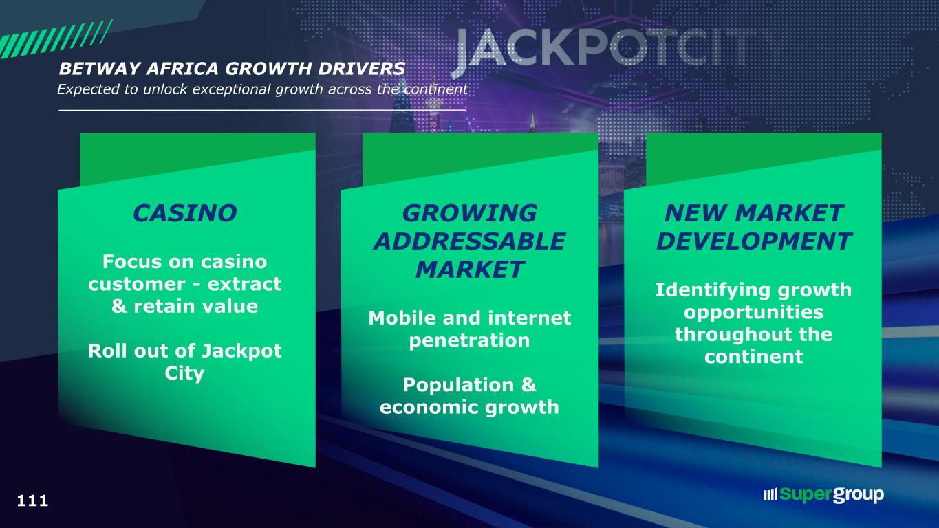 111 BETWAY AFRICA GROWTH DRIVERS CASINO Focus on casino customer - extract & retain value Roll out of Jackpot City GROWING ADDRESSABLE MARKET Mobile and internet penetration Population & economic growth NEW MARKET DEVELOPMENT Identifying growth opportunities throughout the continent Expected to unlock exceptional growth across the continent