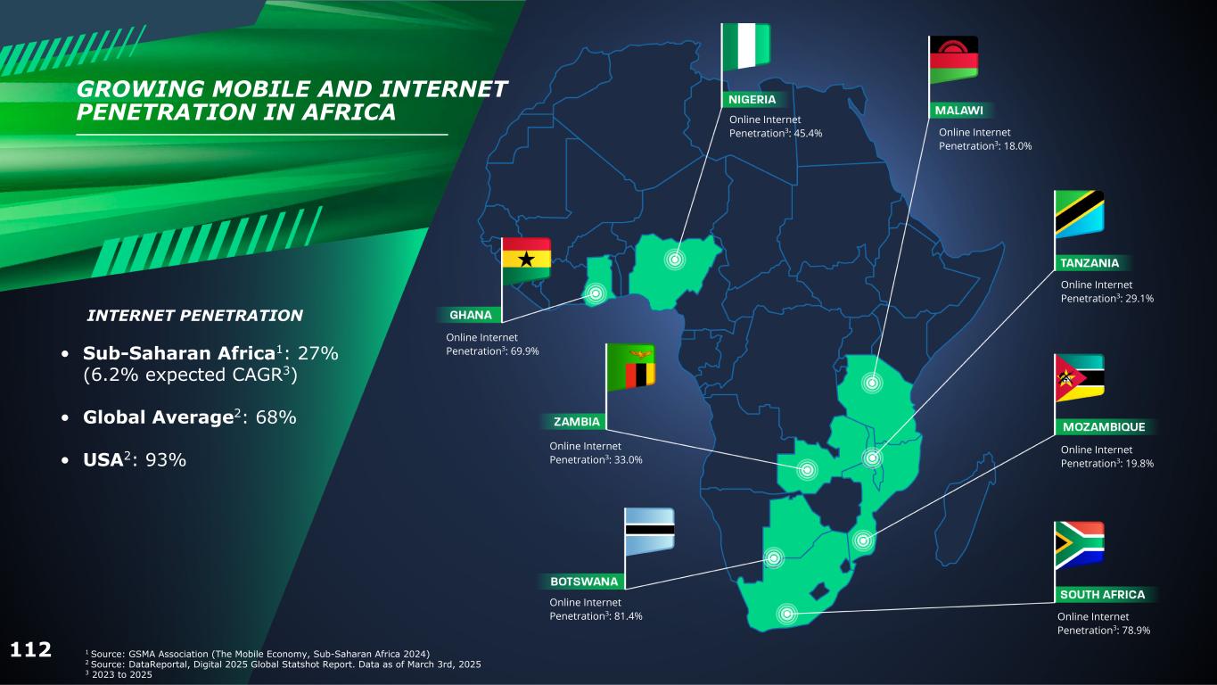 112 GROWING MOBILE AND INTERNET PENETRATION IN AFRICA Online Internet Penetration3: 69.9% 1 Source: GSMA Association (The Mobile Economy, Sub-Saharan Africa 2024) 2 Source: DataReportal, Digital 2025 Global Statshot Report. Data as of March 3rd, 2025 3 2023 to 2025 INTERNET PENETRATION • Sub-Saharan Africa1: 27% (6.2% expected CAGR3) • Global Average2: 68% • USA2: 93% Online Internet Penetration3: 33.0% Online Internet Penetration3: 81.4% Online Internet Penetration3: 78.9% Online Internet Penetration3: 19.8% Online Internet Penetration3: 29.1% Online Internet Penetration3: 18.0% Online Internet Penetration3: 45.4%