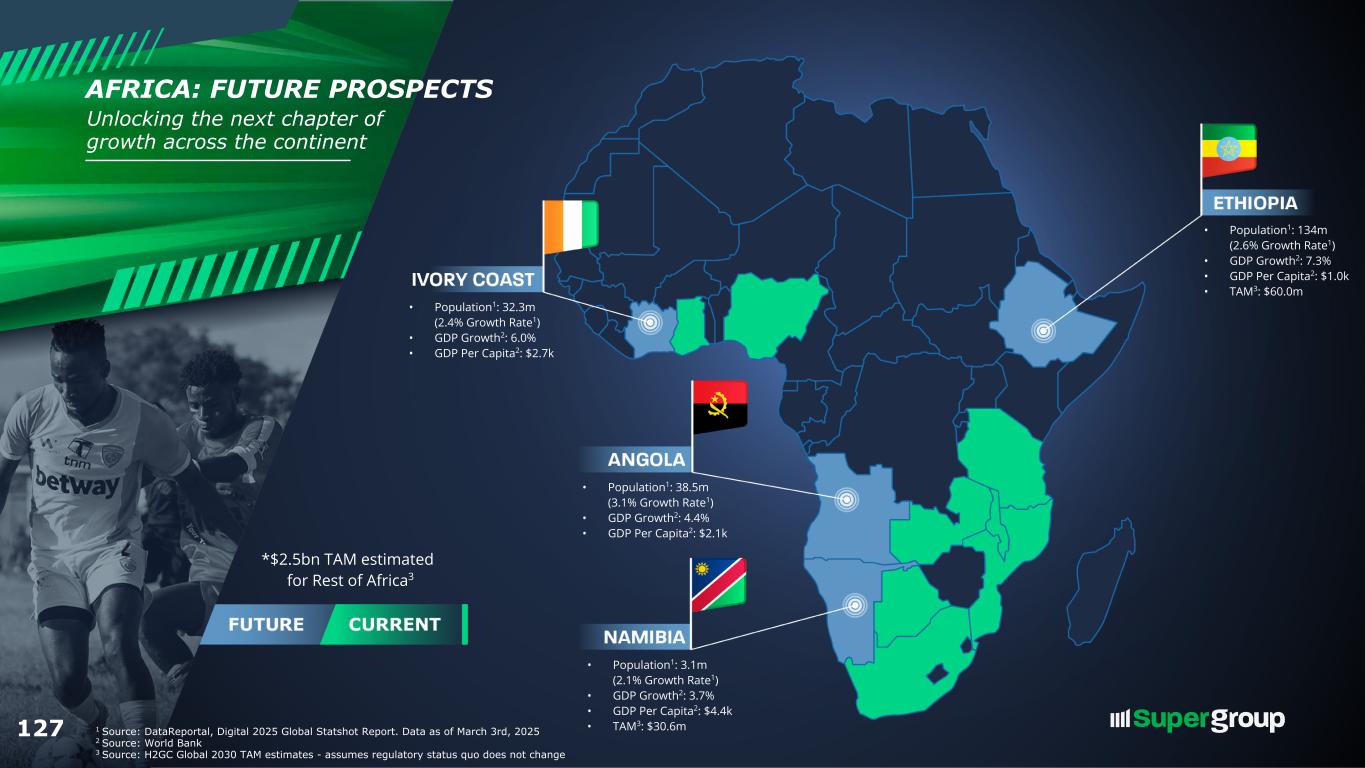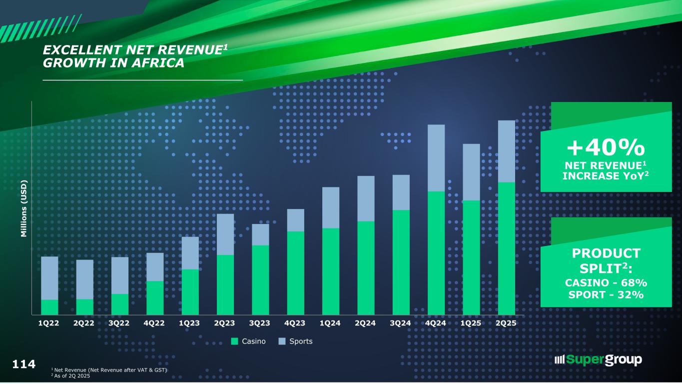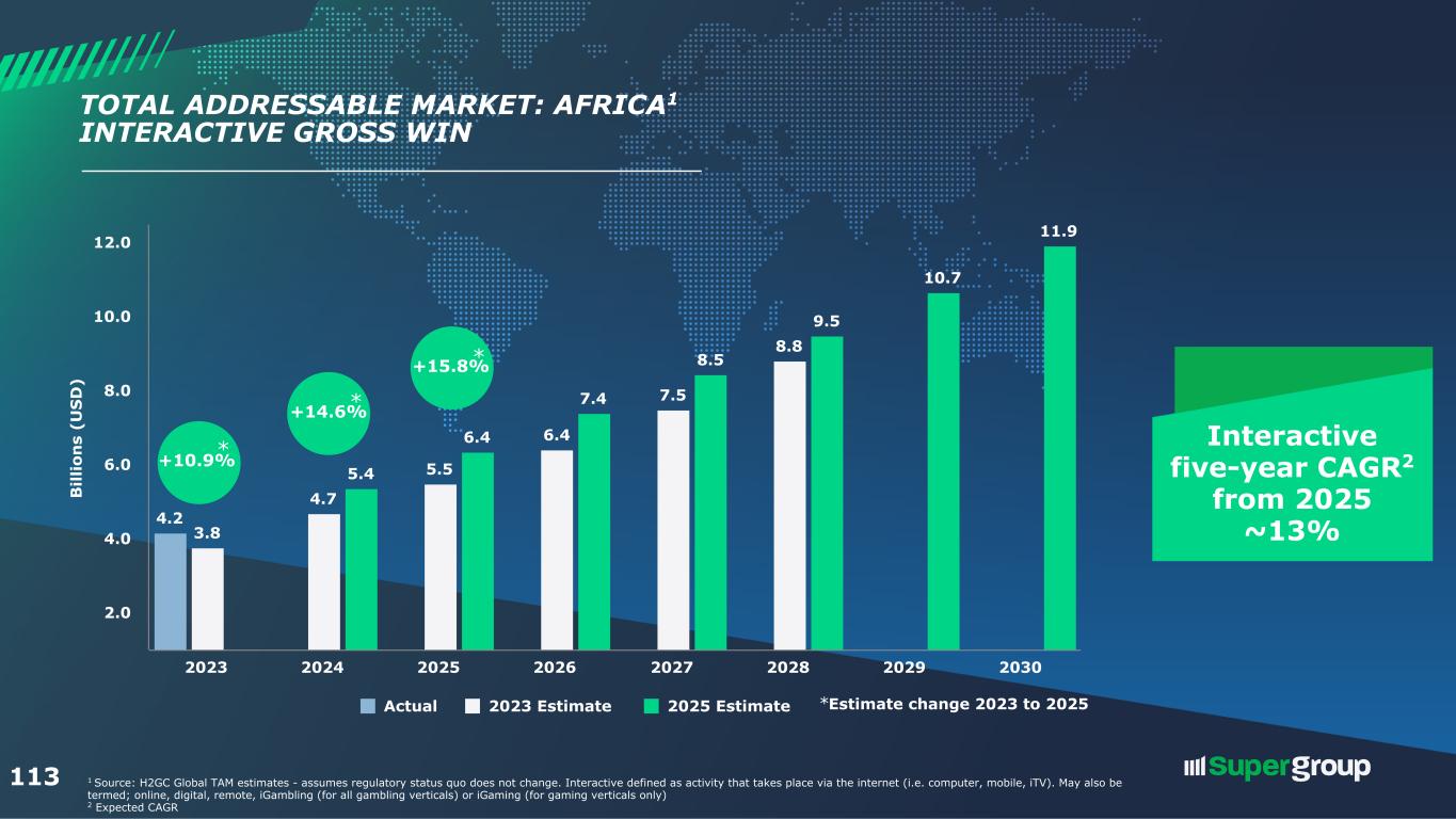 B ill io n s (U S D ) 4.2 3.8 4.7 5.5 6.4 7.5 8.8 5.4 6.4 7.4 8.5 9.5 10.7 11.9 Actual 2023 Estimate 2025 Estimate 2023 2024 2025 2026 2027 2028 2029 2030 2.0 4.0 6.0 8.0 10.0 12.0 Interactive five-year CAGR2 from 2025 ~13% 113 1 Source: H2GC Global TAM estimates - assumes regulatory status quo does not change. Interactive defined as activity that takes place via the internet (i.e. computer, mobile, iTV). May also be termed; online, digital, remote, iGambling (for all gambling verticals) or iGaming (for gaming verticals only) 2 Expected CAGR TOTAL ADDRESSABLE MARKET: AFRICA1 INTERACTIVE GROSS WIN +10.9% +14.6% +15.8% * * * *Estimate change 2023 to 2025