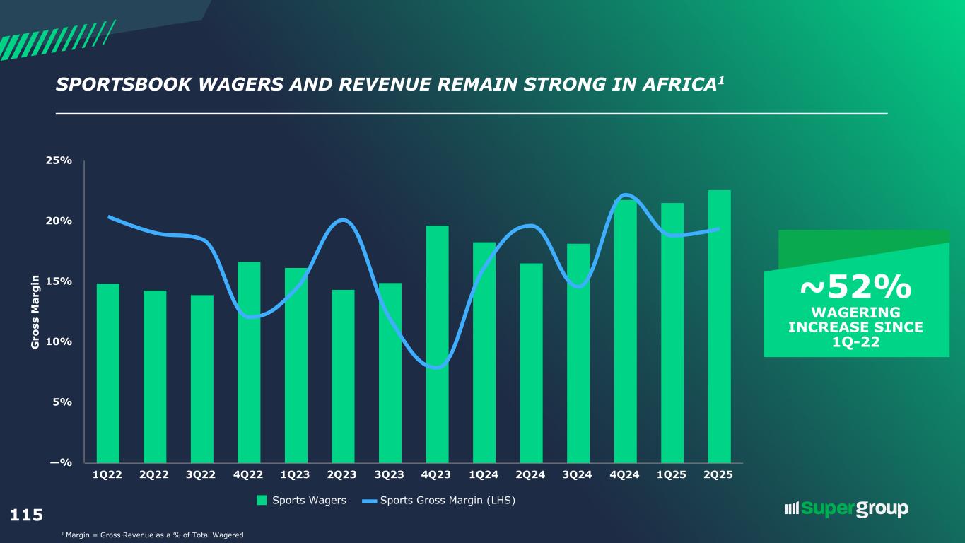 114 M ill io n s (U S D ) Casino Sports 1Q22 2Q22 3Q22 4Q22 1Q23 2Q23 3Q23 4Q23 1Q24 2Q24 3Q24 4Q24 1Q25 2Q25 +40% NET REVENUE1 INCREASE YoY2 1 Net Revenue (Net Revenue after VAT & GST) 2 As of 2Q 2025 EXCELLENT NET REVENUE1 GROWTH IN AFRICA PRODUCT SPLIT2: CASINO - 68% SPORT - 32%