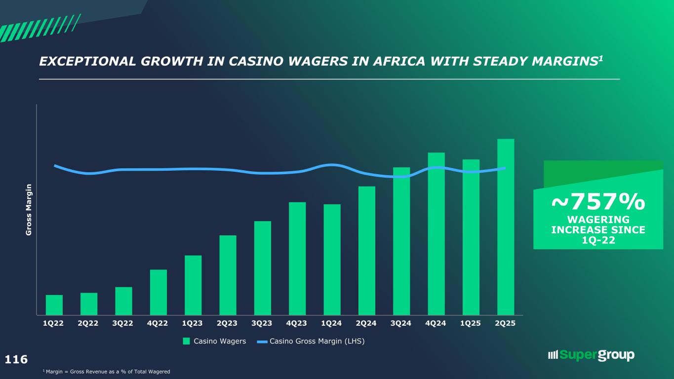 115 G ro ss M ar g in Sports Wagers Sports Gross Margin (LHS) 1Q22 2Q22 3Q22 4Q22 1Q23 2Q23 3Q23 4Q23 1Q24 2Q24 3Q24 4Q24 1Q25 2Q25 —% 5% 10% 15% 20% 25% ~52% WAGERING INCREASE SINCE 1Q-22 1 Margin = Gross Revenue as a % of Total Wagered SPORTSBOOK WAGERS AND REVENUE REMAIN STRONG IN AFRICA1