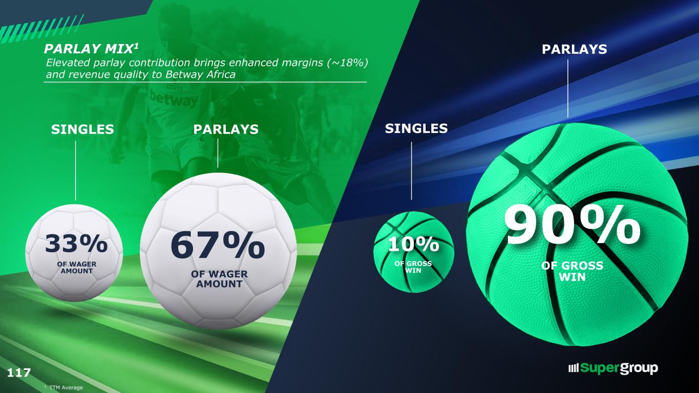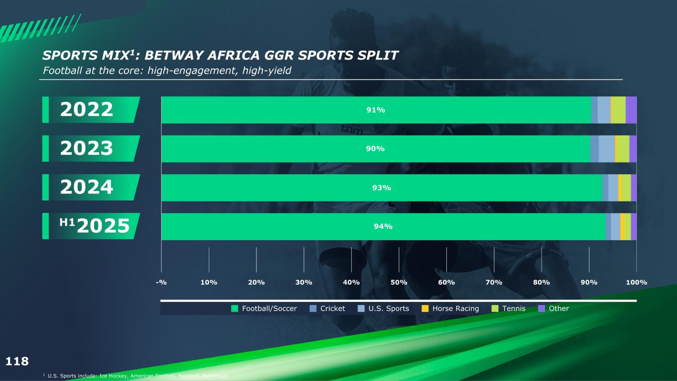117 1 TTM Average PARLAY MIX1 SINGLES PARLAYS PARLAYS SINGLES 33% 67% OF WAGER AMOUNT OF WAGER AMOUNT OF GROSS WIN OF GROSS WIN Elevated parlay contribution brings enhanced margins (~18%) and revenue quality to Betway Africa