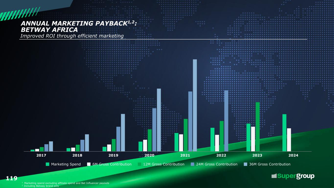 Improved ROI through efficient marketing 119 Marketing Spend 6M Gross Contribution 12M Gross Contribution 24M Gross Contribution 36M Gross Contribution 2017 2018 2019 2020 2021 2022 2023 2024 ANNUAL MARKETING PAYBACK1,2: BETWAY AFRICA 1 Marketing spend excluding affiliate spend and Bet Influencer payouts 2 Including Betway brand only