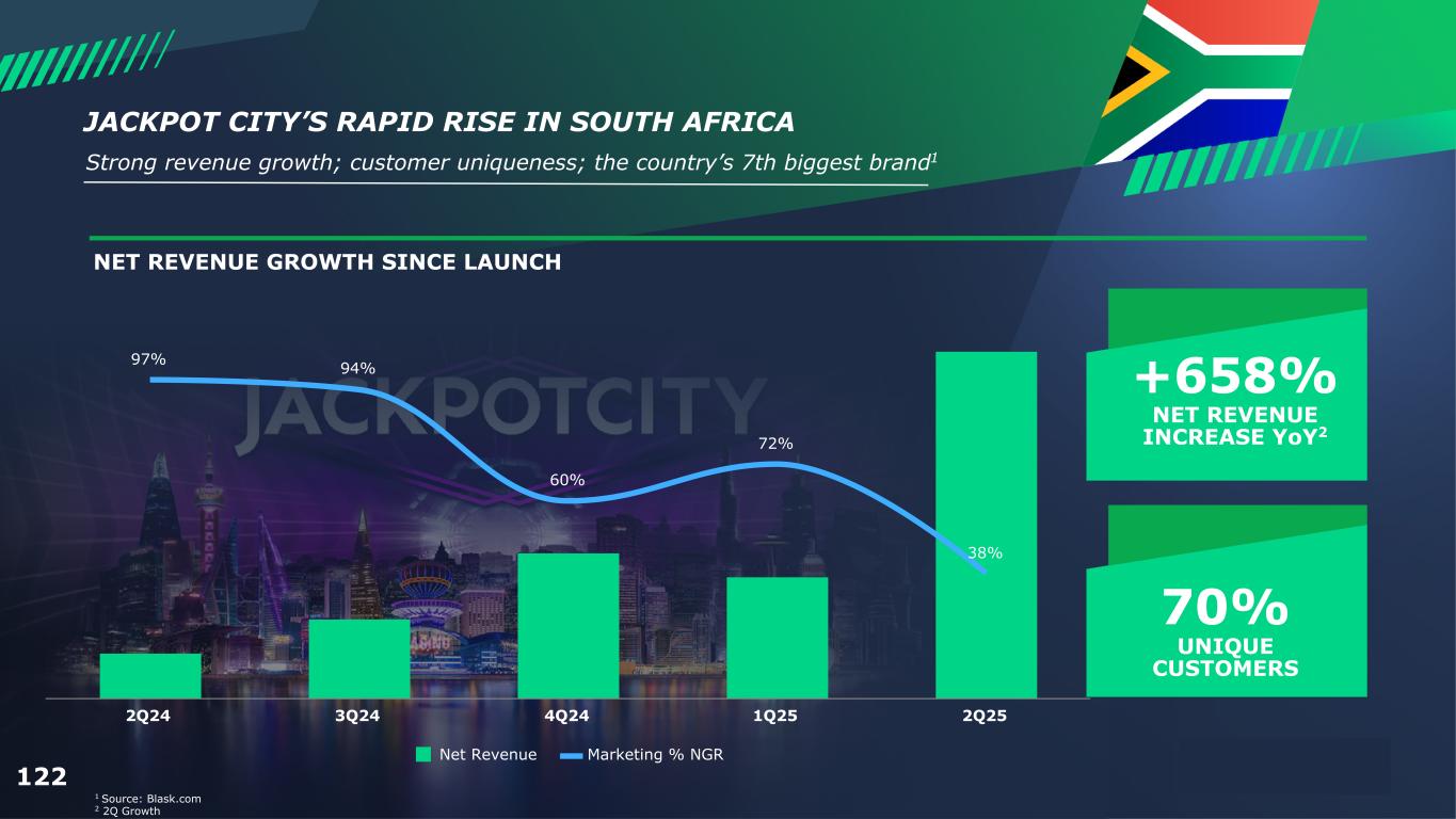 Strong revenue growth; customer uniqueness; the country’s 7th biggest brand1 97% 94% 60% 72% 38% Net Revenue Marketing % NGR 2Q24 3Q24 4Q24 1Q25 2Q25 122 JACKPOT CITY’S RAPID RISE IN SOUTH AFRICA NET REVENUE GROWTH SINCE LAUNCH 70% UNIQUE CUSTOMERS +658% NET REVENUE INCREASE YoY2 1 Source: Blask.com 2 2Q Growth