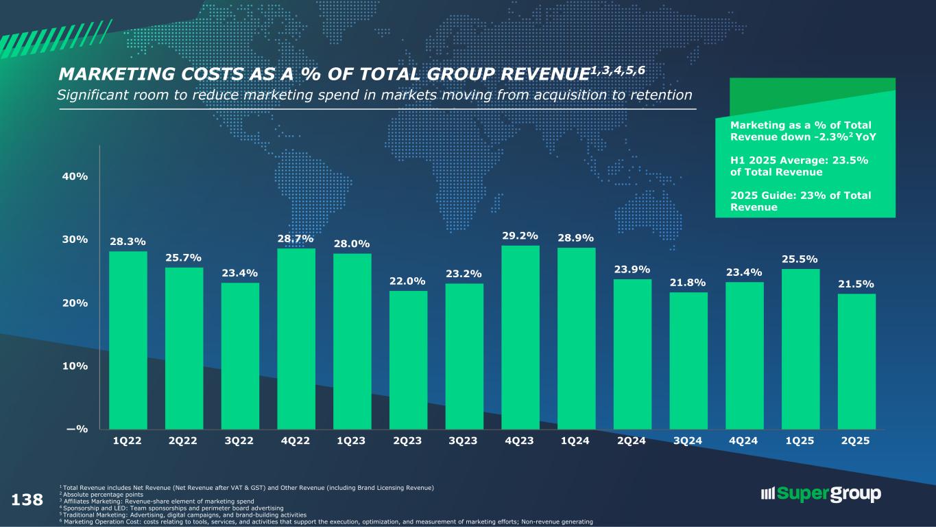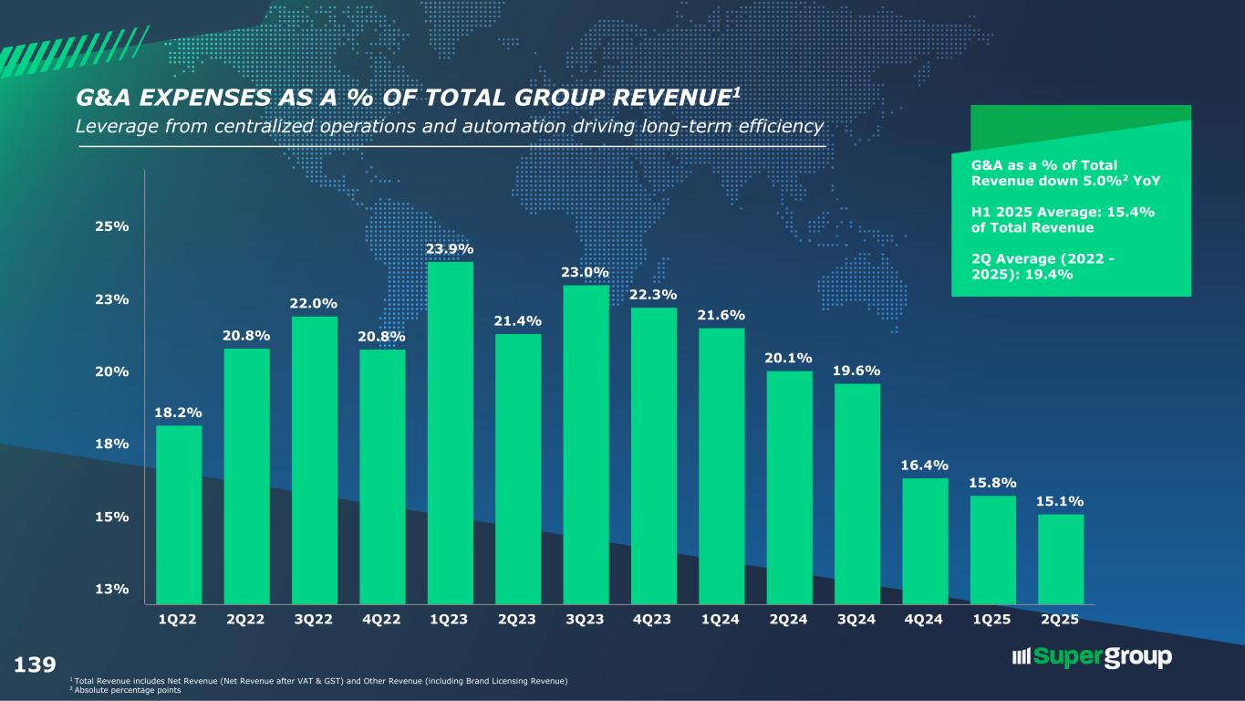 MARKETING COSTS AS A % OF TOTAL GROUP REVENUE1,3,4,5,6 138 1 Total Revenue includes Net Revenue (Net Revenue after VAT & GST) and Other Revenue (including Brand Licensing Revenue) 2 Absolute percentage points 3 Affiliates Marketing: Revenue-share element of marketing spend 4 Sponsorship and LED: Team sponsorships and perimeter board advertising 5 Traditional Marketing: Advertising, digital campaigns, and brand-building activities 6 Marketing Operation Cost: costs relating to tools, services, and activities that support the execution, optimization, and measurement of marketing efforts; Non-revenue generating 28.3% 25.7% 23.4% 28.7% 28.0% 22.0% 23.2% 29.2% 28.9% 23.9% 21.8% 23.4% 25.5% 21.5% 1Q22 2Q22 3Q22 4Q22 1Q23 2Q23 3Q23 4Q23 1Q24 2Q24 3Q24 4Q24 1Q25 2Q25 —% 10% 20% 30% 40% Marketing as a % of Total Revenue down -2.3%2 YoY H1 2025 Average: 23.5% of Total Revenue 2025 Guide: 23% of Total Revenue Significant room to reduce marketing spend in markets moving from acquisition to retention