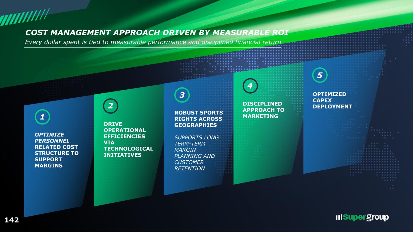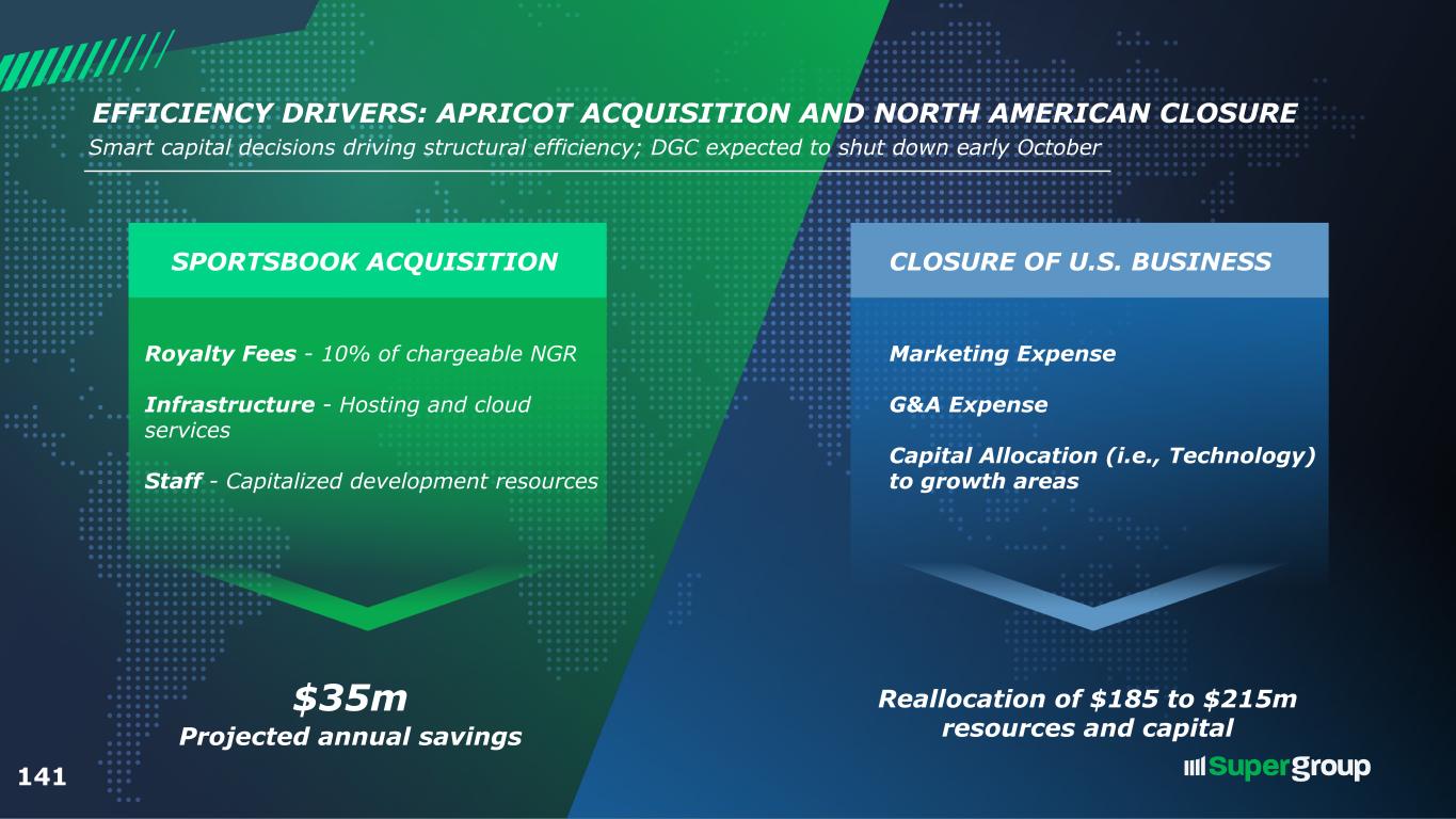 141 EFFICIENCY DRIVERS: APRICOT ACQUISITION AND NORTH AMERICAN CLOSURE Royalty Fees - 10% of chargeable NGR Infrastructure - Hosting and cloud services Staff - Capitalized development resources Marketing Expense G&A Expense Capital Allocation (i.e., Technology) to growth areas Smart capital decisions driving structural efficiency; DGC expected to shut down early October $35m Projected annual savings Reallocation of $185 to $215m resources and capital SPORTSBOOK ACQUISITION CLOSURE OF U.S. BUSINESS