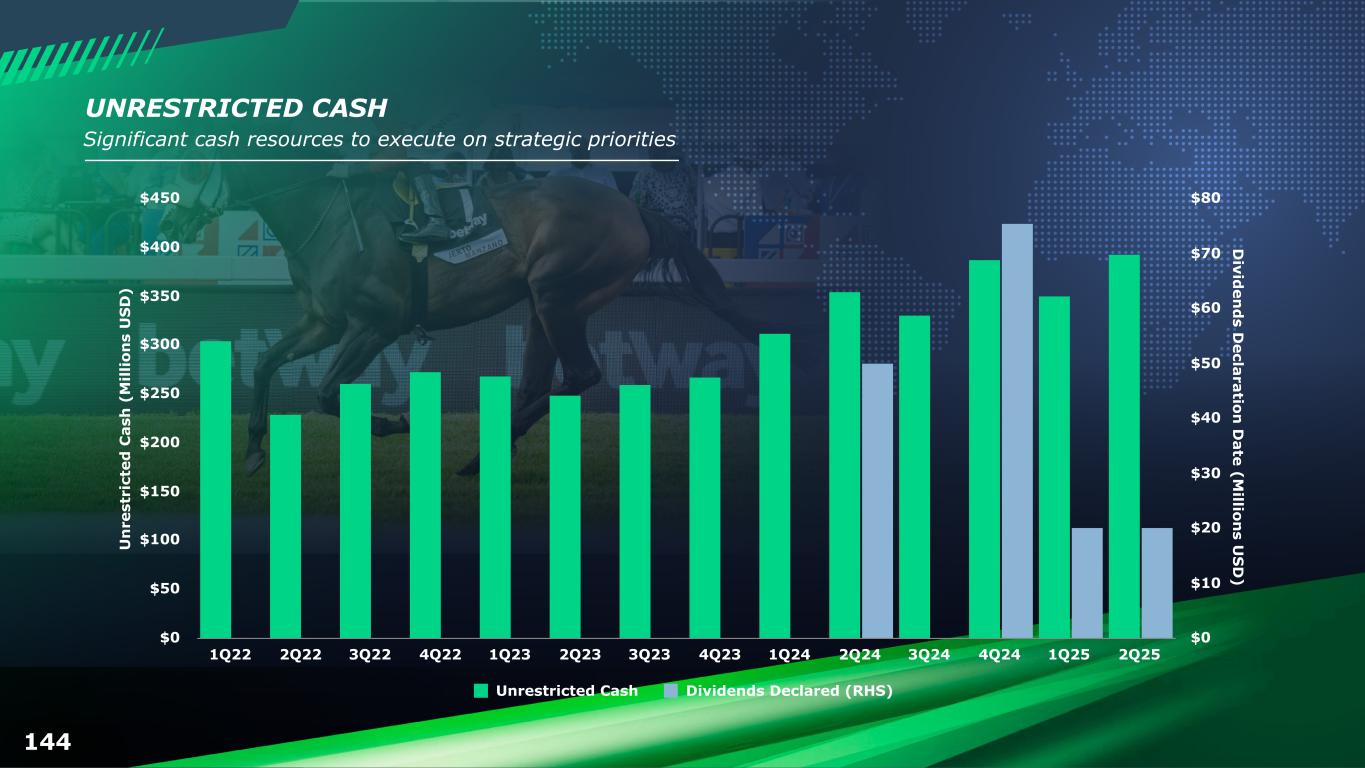 144 U n re st ri ct ed C as h ( M ill io n s U S D ) D ivid en d s D eclaration D ate (M illion s U S D ) Unrestricted Cash Dividends Declared (RHS) 1Q22 2Q22 3Q22 4Q22 1Q23 2Q23 3Q23 4Q23 1Q24 2Q24 3Q24 4Q24 1Q25 2Q25 $0 $50 $100 $150 $200 $250 $300 $350 $400 $450 $0 $10 $20 $30 $40 $50 $60 $70 $80 UNRESTRICTED CASH Significant cash resources to execute on strategic priorities