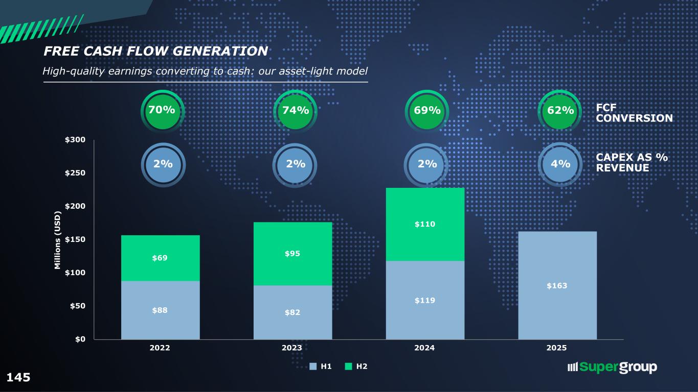M ill io n s (U S D ) $88 $82 $119 $163 $69 $95 $110 H1 H2 2022 2023 2024 2025 $0 $50 $100 $150 $200 $250 $300 145 FREE CASH FLOW GENERATION High-quality earnings converting to cash: our asset-light model FCF CONVERSION 4% CAPEX AS % REVENUE 62% 2% 2% 70% 74% 69% 2%