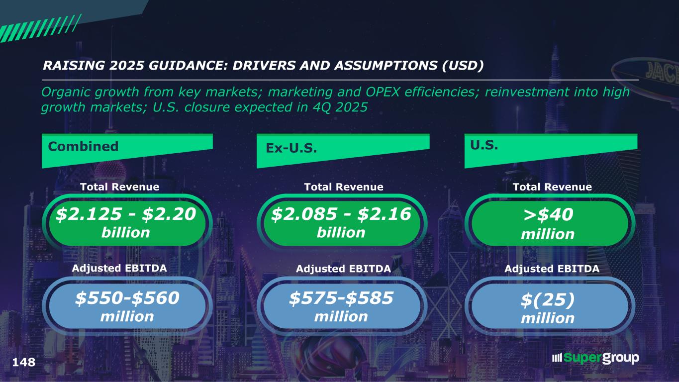 >$2.04 billion Total Revenue Adjusted EBITDA $470-$480 million $500-$510 million Combined U.S.Ex-U.S. >$40 million $(30) million PREVIOUSLY RAISED GUIDANCE: AUGUST 6TH, 2025 (USD)1 147 Total Revenue Adjusted EBITDA Total Revenue Adjusted EBITDA >$2.0 billion 1 Guidance provided for 2Q 2025, August 6th, 2025