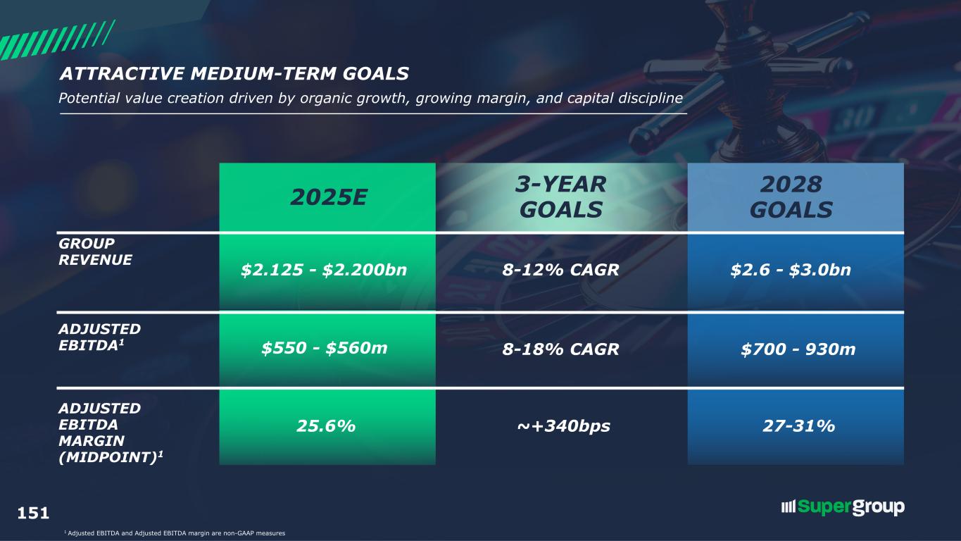 ADJUSTED EBITDA1 151 GROUP REVENUE ATTRACTIVE MEDIUM-TERM GOALS ADJUSTED EBITDA MARGIN (MIDPOINT)1 2025E 3-YEAR GOALS 2028 GOALS 25.6% ~+340bps 27-31% $550 - $560m $2.125 - $2.200bn 8-18% CAGR $700 - 930m 8-12% CAGR $2.6 - $3.0bn Potential value creation driven by organic growth, growing margin, and capital discipline 1 Adjusted EBITDA and Adjusted EBITDA margin are non-GAAP measures