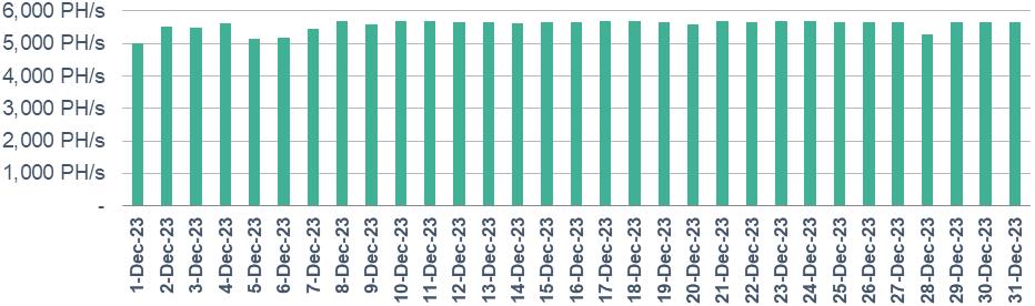 The project achieved average monthly operating hashrate of 2,574 PH/s in December compared to 2,583 PH/s last month.