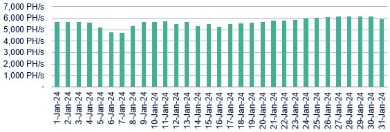 The project achieved average monthly operating hashrate of 2,578 PH/s in January compared to 2,574 PH/s last month.