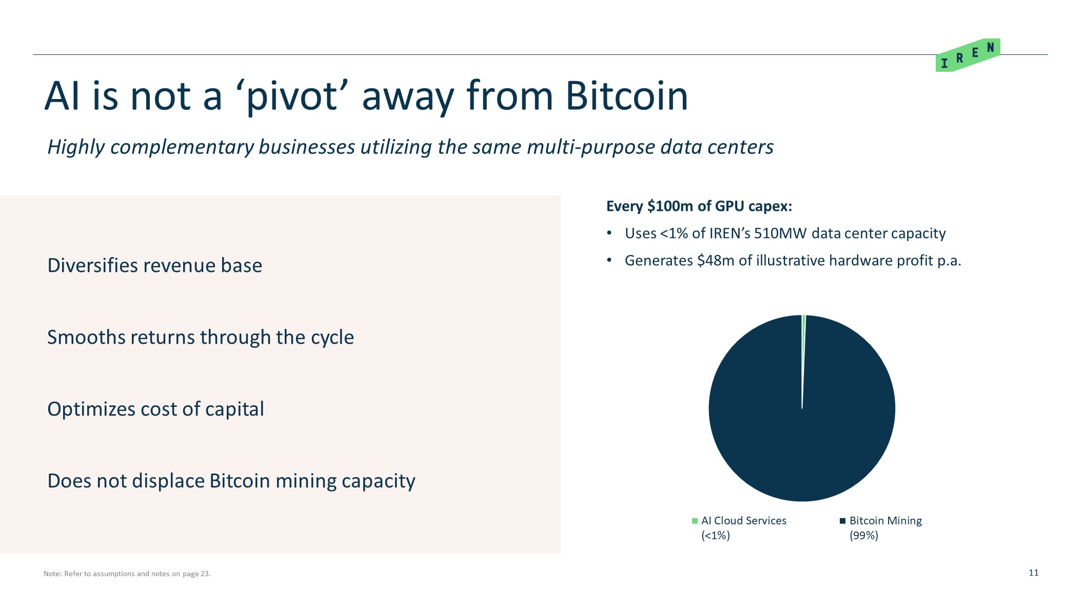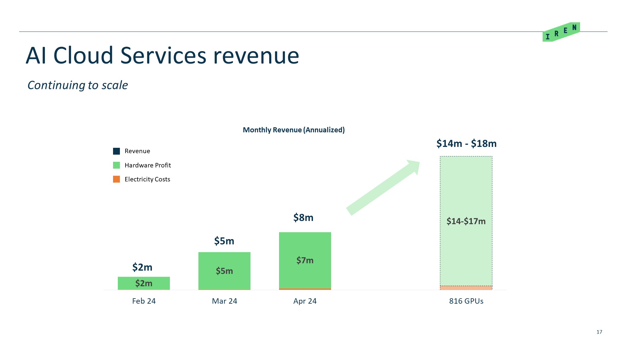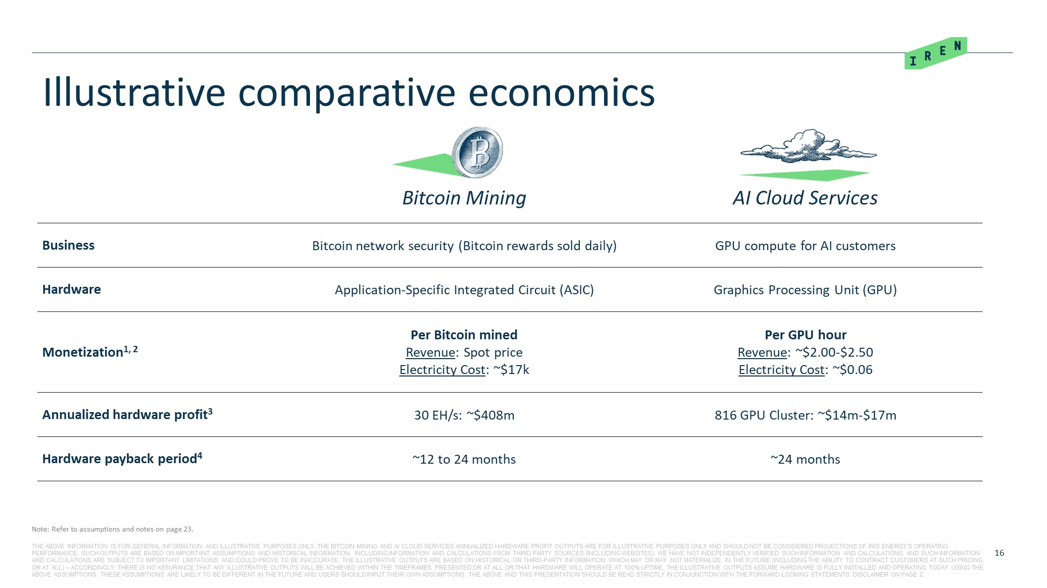 Illustrative comparative economics  Bitcoin Mining  AI Cloud Services  Business  Bitcoin network security (Bitcoin rewards sold daily)  GPU compute for AI customers  Hardware  Application-Specific Integrated Circuit (ASIC)  Graphics Processing Unit (GPU)  Monetization1, 2  Per Bitcoin mined  Revenue: Spot price  Electricity Cost: ~$17k  Per GPU hour  Revenue: ~$2.00-$2.50  Electricity Cost: ~$0.06  Annualized hardware profit3  30 EH/s: ~$408m  816 GPU Cluster: ~$14m-$17m  Hardware payback period4  ~12 to 24 months  ~24 months  16  THE ABOVE INFORMATION IS FOR GENERAL INFORMATION and illustrative PURPOSES ONLY. THE BITCOIN MINING AND AI CLOUD SERVICES ANNUALIZED HARDWARE PROFIT OUTPUTS ARE FOR ILLUSTRATIVE PURPOSES ONLY AND SHOULD NOT BE CONSIDERED PROJECTIONS OF IRIS ENERGY’S OPERATING PERFORMANCE. SUCH OUTPUTS ARE BASED ON IMPORTANT ASSUMPTIONS AND HISTORICAL INFORMATION, INCLUDING INFORMATION AND CALCULATIONS FROM THIRD PARTY SOURCES (INCLUDING WEBSITES). WE HAVE NOT INDEPENDENTLY VERIFIED SUCH INFORMATION AND CALCULATIONS, AND SUCH INFORMATION AND CALCULATIONS ARE SUBJECT TO IMPORTANT LIMITATIONS AND COULD PROVE TO BE INACCURATE. THE ILLUSTRATIVE OUTPUTS ARE BASED ON HISTORICAL OR THIRD-PARTY INFORMATION WHICH MAY OR MAY NOT MATERIALIZE IN THE FUTURE (INCLUDING THE ABILITY TO CONTRACT CUSTOMERS AT SUCH PRICING, OR AT ALL) – accordingly, there is no assurance that any illustrative outputs WILL BE ACHIEVED within the timeframes presented or at all OR THAT HARDWARE WILL OPERATE AT 100% UPTIME. The illustrative outputs assume HARDWARE is fully installed and operating today using the above assumptions. These assumptions are likely to be different in the future and users should input their own assumptions. THE ABOVE AND THIS PRESENTATION SHOULD BE READ STRICTLY IN CONJUNCTION WITH THE FORWARD-LOOKING STATEMENTS DISCLAIMER ON PAGE 2.   Note: Refer to assumptions and notes on page 23.