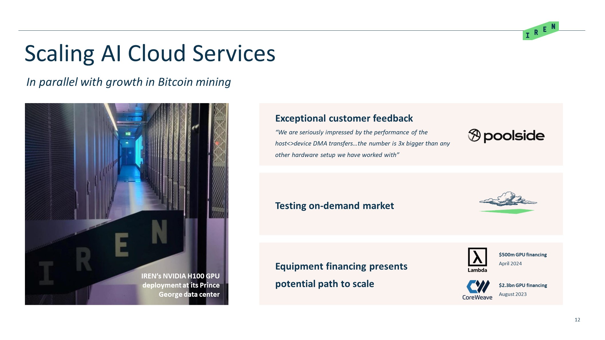 Scaling AI Cloud Services  Exceptional customer feedback  “We are seriously impressed by the performance of the host<>device DMA transfers…the number is 3x bigger than any other hardware setup we have worked with”  12  IREN’s NVIDIA H100 GPU deployment at its Prince George data center  In parallel with growth in Bitcoin mining  Testing on-demand market  Equipment financing presents potential path to scale   $500m GPU financing  April 2024  $2.3bn GPU financing  August 2023
