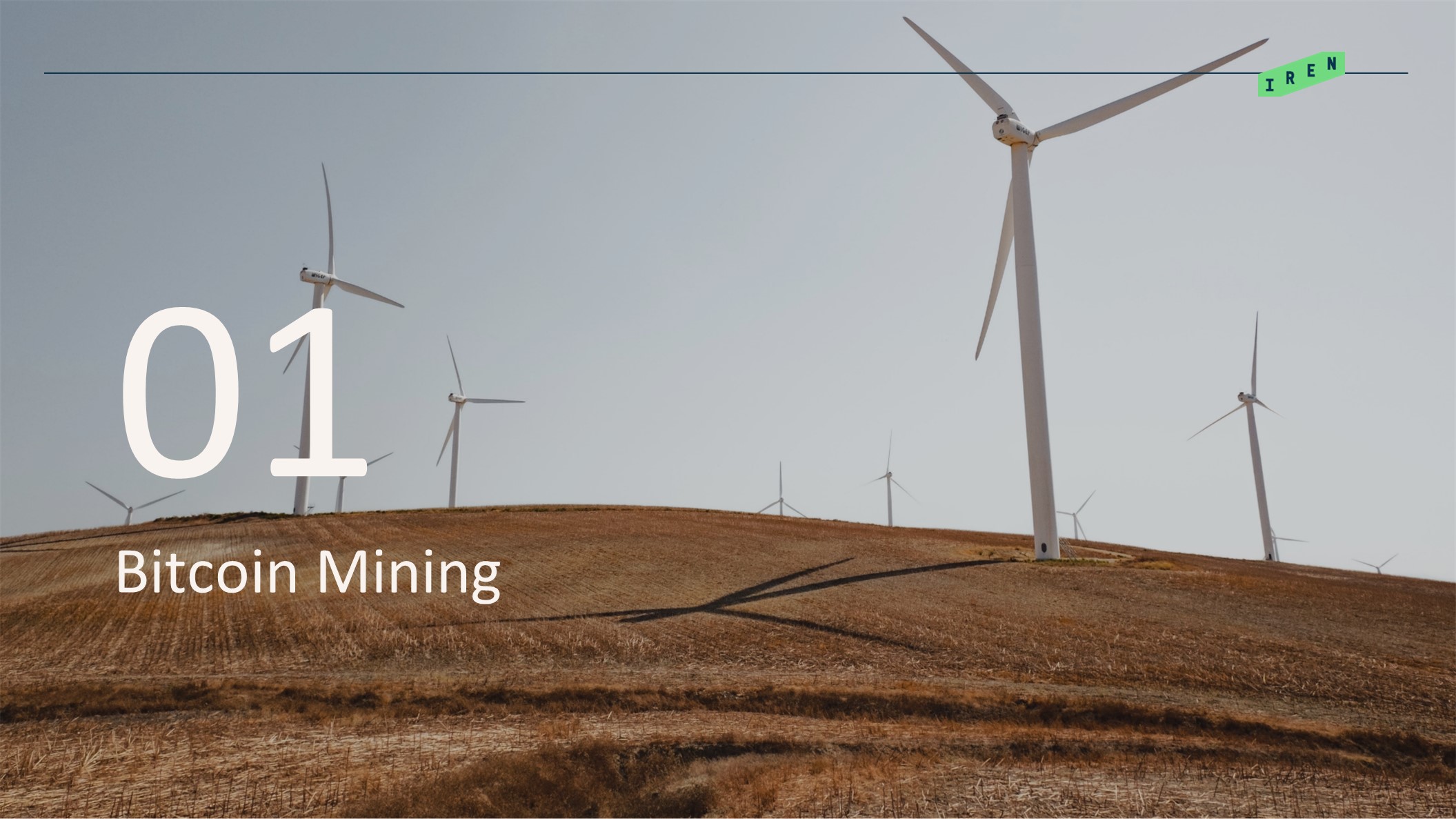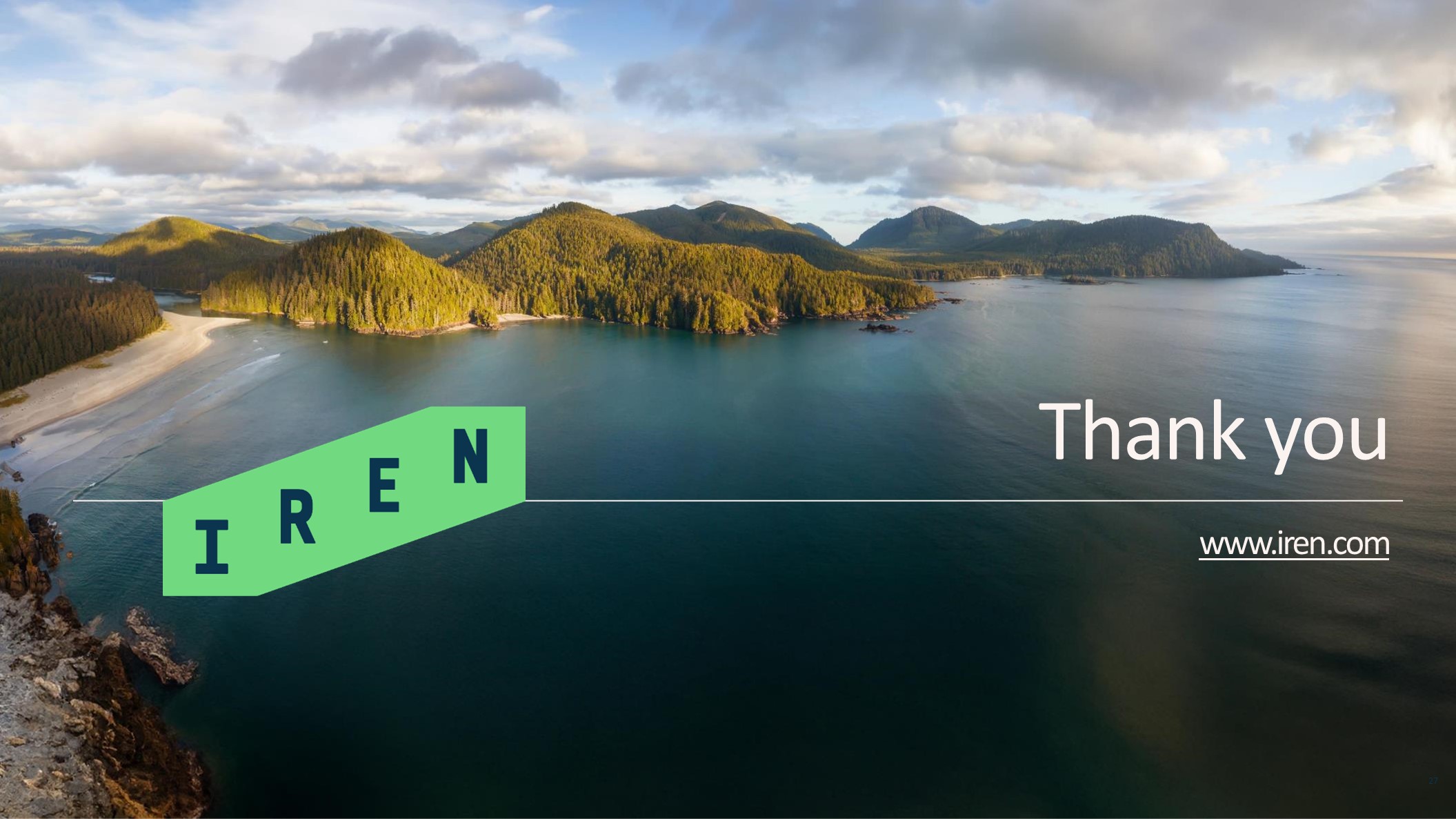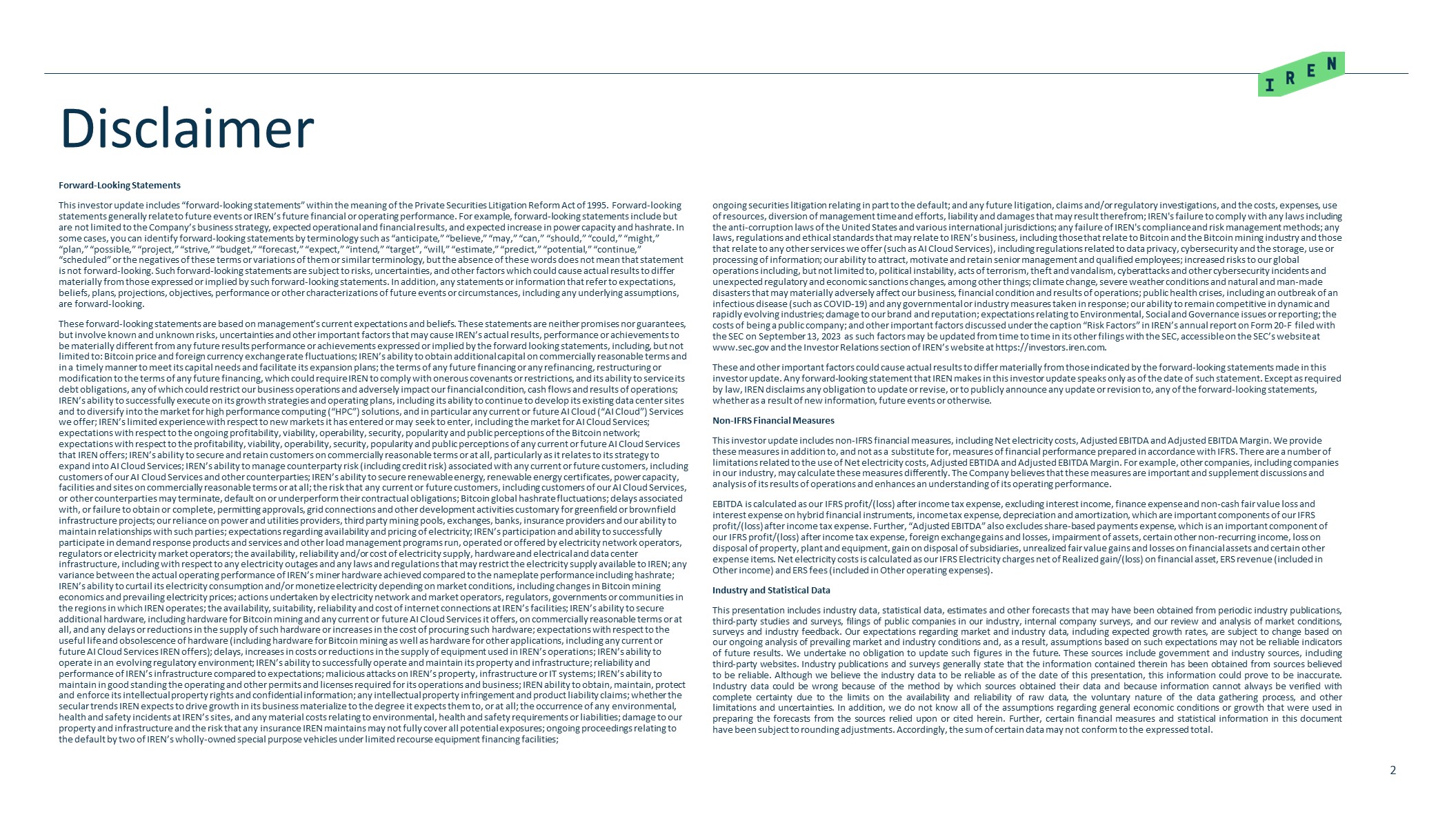 Disclaimer  Forward-Looking Statements   This investor update includes “forward-looking statements” within the meaning of the Private Securities Litigation Reform Act of 1995. Forward-looking statements generally relate to future events or IREN’s future financial or operating performance. For example, forward-looking statements include but are not limited to the Company’s business strategy, expected operational and financial results, and expected increase in power capacity and hashrate. In some cases, you can identify forward-looking statements by terminology such as “anticipate,” “believe,” “may,” “can,” “should,” “could,” “might,” “plan,” “possible,” “project,” “strive,” “budget,” “forecast,” “expect,” “intend,” “target”, “will,” “estimate,” “predict,” “potential,” “continue,” “scheduled” or the negatives of these terms or variations of them or similar terminology, but the absence of these words does not mean that statement is not forward-looking. Such forward-looking statements are subject to risks, uncertainties, and other factors which could cause actual results to differ materially from those expressed or implied by such forward-looking statements. In addition, any statements or information that refer to expectations, beliefs, plans, projections, objectives, performance or other characterizations of future events or circumstances, including any underlying assumptions, are forward-looking.  These forward-looking statements are based on management’s current expectations and beliefs. These statements are neither promises nor guarantees, but involve known and unknown risks, uncertainties and other important factors that may cause IREN’s actual results, performance or achievements to be materially different from any future results performance or achievements expressed or implied by the forward looking statements, including, but not limited to: Bitcoin price and foreign currency exchange rate fluctuations; IREN’s ability to obtain additional capital on commercially reasonable terms and in a timely manner to meet its capital needs and facilitate its expansion plans; the terms of any future financing or any refinancing, restructuring or modification to the terms of any future financing, which could require IREN to comply with onerous covenants or restrictions, and its ability to service its debt obligations, any of which could restrict our business operations and adversely impact our financial condition, cash flows and results of operations; IREN’s ability to successfully execute on its growth strategies and operating plans, including its ability to continue to develop its existing data center sites and to diversify into the market for high performance computing (“HPC”) solutions, and in particular any current or future AI Cloud (“AI Cloud”) Services we offer; IREN’s limited experience with respect to new markets it has entered or may seek to enter, including the market for AI Cloud Services; expectations with respect to the ongoing profitability, viability, operability, security, popularity and public perceptions of the Bitcoin network; expectations with respect to the profitability, viability, operability, security, popularity and public perceptions of any current or future AI Cloud Services that IREN offers; IREN’s ability to secure and retain customers on commercially reasonable terms or at all, particularly as it relates to its strategy to expand into AI Cloud Services; IREN’s ability to manage counterparty risk (including credit risk) associated with any current or future customers, including customers of our AI Cloud Services and other counterparties; IREN’s ability to secure renewable energy, renewable energy certificates, power capacity, facilities and sites on commercially reasonable terms or at all; the risk that any current or future customers, including customers of our AI Cloud Services, or other counterparties may terminate, default on or underperform their contractual obligations; Bitcoin global hashrate fluctuations; delays associated with, or failure to obtain or complete, permitting approvals, grid connections and other development activities customary for greenfield or brownfield infrastructure projects; our reliance on power and utilities providers, third party mining pools, exchanges, banks, insurance providers and our ability to maintain relationships with such parties; expectations regarding availability and pricing of electricity; IREN’s participation and ability to successfully participate in demand response products and services and other load management programs run, operated or offered by electricity network operators, regulators or electricity market operators; the availability, reliability and/or cost of electricity supply, hardware and electrical and data center infrastructure, including with respect to any electricity outages and any laws and regulations that may restrict the electricity supply available to IREN; any variance between the actual operating performance of IREN’s miner hardware achieved compared to the nameplate performance including hashrate; IREN’s ability to curtail its electricity consumption and/or monetize electricity depending on market conditions, including changes in Bitcoin mining economics and prevailing electricity prices; actions undertaken by electricity network and market operators, regulators, governments or communities in the regions in which IREN operates; the availability, suitability, reliability and cost of internet connections at IREN’s facilities; IREN’s ability to secure additional hardware, including hardware for Bitcoin mining and any current or future AI Cloud Services it offers, on commercially reasonable terms or at all, and any delays or reductions in the supply of such hardware or increases in the cost of procuring such hardware; expectations with respect to the useful life and ob