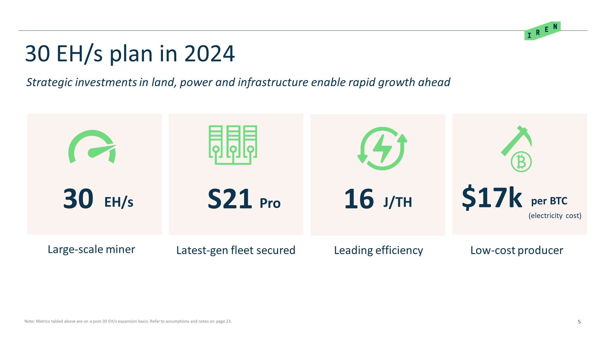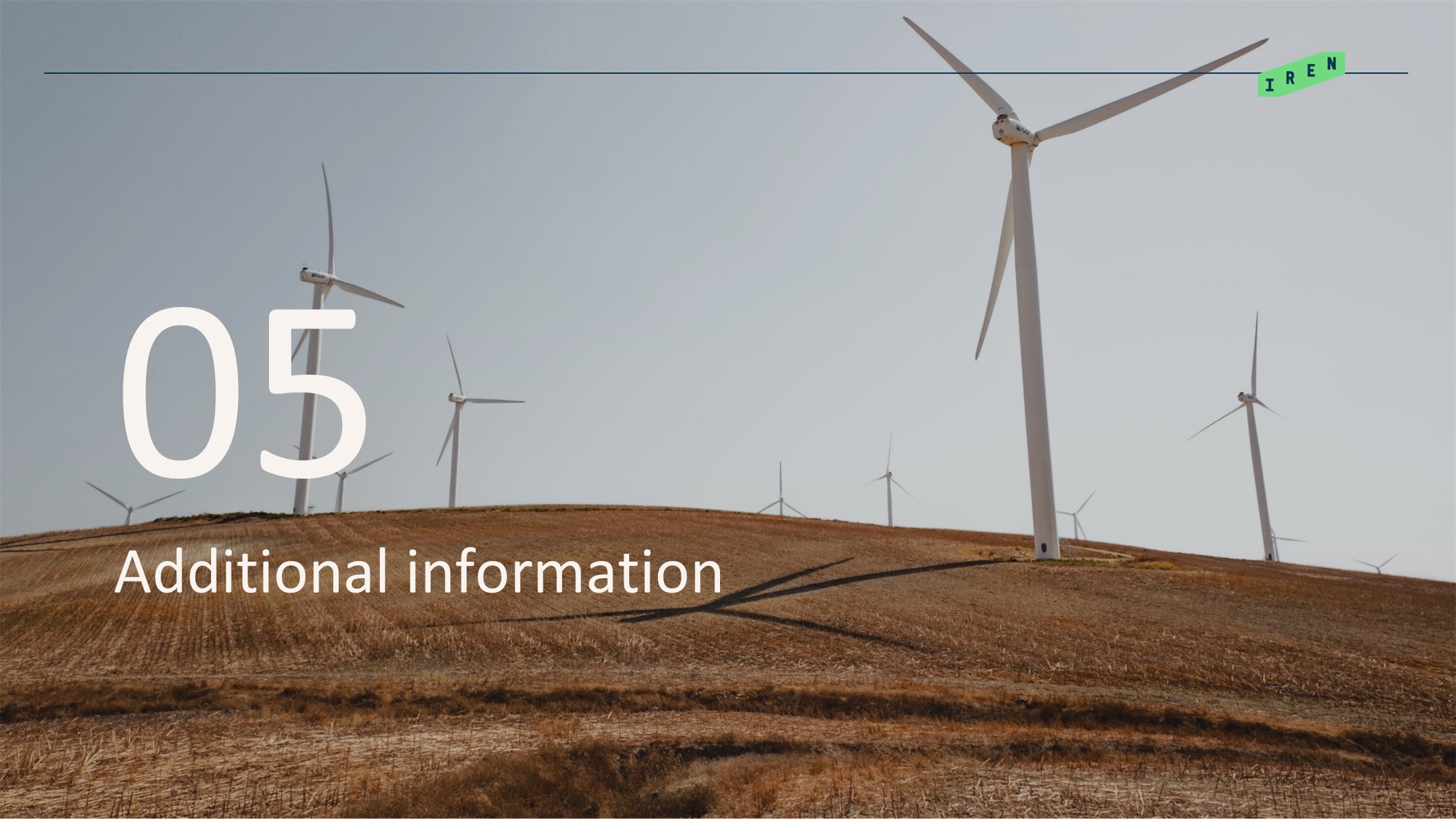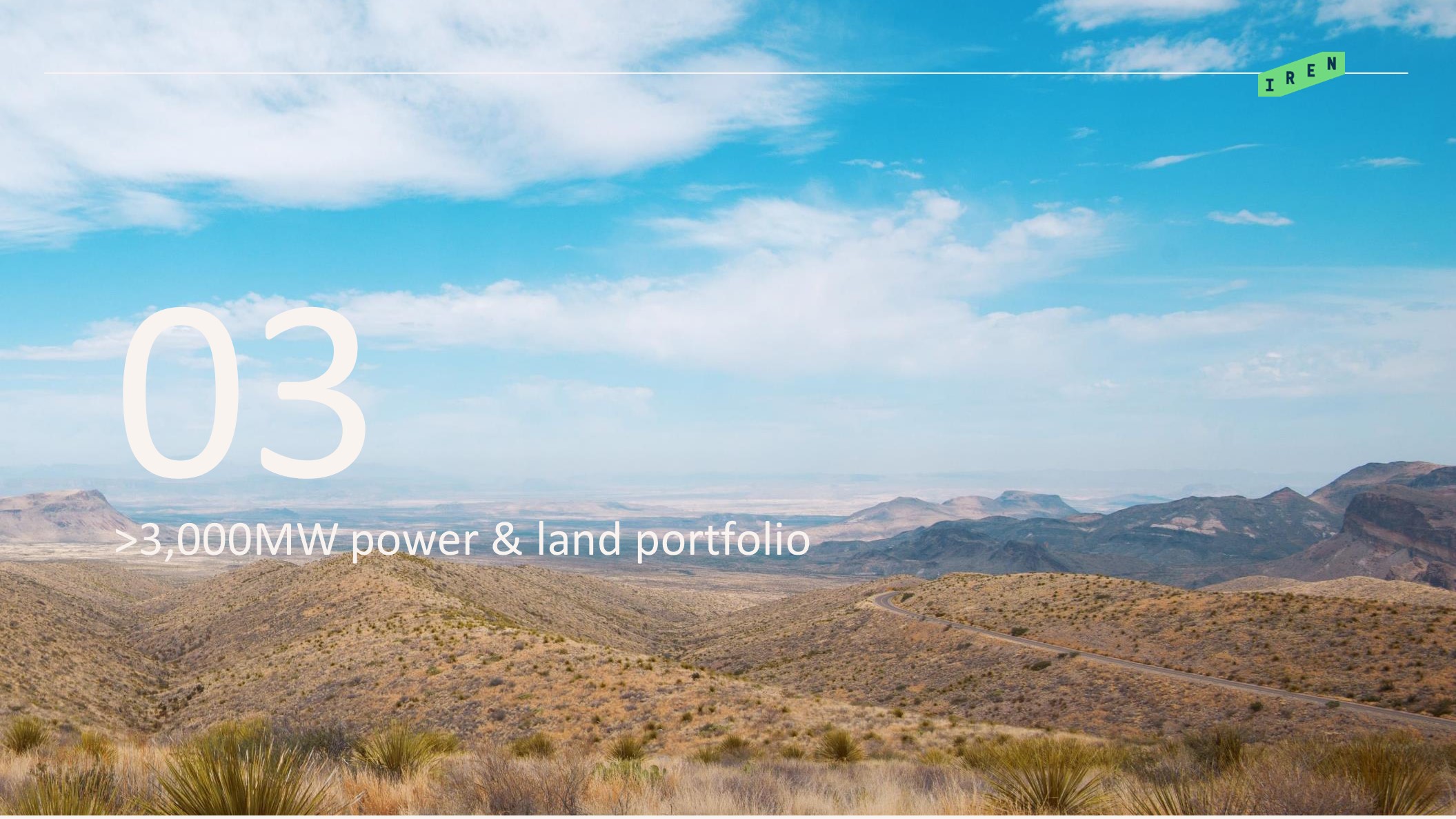 Disclaimer  Forward-Looking Statements   This investor update includes “forward-looking statements” within the meaning of the Private Securities Litigation Reform Act of 1995. Forward-looking statements generally relate to future events or IREN’s future financial or operating performance. For example, forward-looking statements include but are not limited to the Company’s business strategy, expected operational and financial results, and expected increase in power capacity and hashrate. In some cases, you can identify forward-looking statements by terminology such as “anticipate,” “believe,” “may,” “can,” “should,” “could,” “might,” “plan,” “possible,” “project,” “strive,” “budget,” “forecast,” “expect,” “intend,” “target”, “will,” “estimate,” “predict,” “potential,” “continue,” “scheduled” or the negatives of these terms or variations of them or similar terminology, but the absence of these words does not mean that statement is not forward-looking. Such forward-looking statements are subject to risks, uncertainties, and other factors which could cause actual results to differ materially from those expressed or implied by such forward-looking statements. In addition, any statements or information that refer to expectations, beliefs, plans, projections, objectives, performance or other characterizations of future events or circumstances, including any underlying assumptions, are forward-looking.  These forward-looking statements are based on management’s current expectations and beliefs. These statements are neither promises nor guarantees, but involve known and unknown risks, uncertainties and other important factors that may cause IREN’s actual results, performance or achievements to be materially different from any future results performance or achievements expressed or implied by the forward looking statements, including, but not limited to: Bitcoin price and foreign currency exchange rate fluctuations; IREN’s ability to obtain additional capital on commercially reasonable terms and in a timely manner to meet its capital needs and facilitate its expansion plans; the terms of any future financing or any refinancing, restructuring or modification to the terms of any future financing, which could require IREN to comply with onerous covenants or restrictions, and its ability to service its debt obligations, any of which could restrict our business operations and adversely impact our financial condition, cash flows and results of operations; IREN’s ability to successfully execute on its growth strategies and operating plans, including its ability to continue to develop its existing data center sites and to diversify into the market for high performance computing (“HPC”) solutions, and in particular any current or future AI Cloud (“AI Cloud”) Services we offer; IREN’s limited experience with respect to new markets it has entered or may seek to enter, including the market for AI Cloud Services; expectations with respect to the ongoing profitability, viability, operability, security, popularity and public perceptions of the Bitcoin network; expectations with respect to the profitability, viability, operability, security, popularity and public perceptions of any current or future AI Cloud Services that IREN offers; IREN’s ability to secure and retain customers on commercially reasonable terms or at all, particularly as it relates to its strategy to expand into AI Cloud Services; IREN’s ability to manage counterparty risk (including credit risk) associated with any current or future customers, including customers of our AI Cloud Services and other counterparties; IREN’s ability to secure renewable energy, renewable energy certificates, power capacity, facilities and sites on commercially reasonable terms or at all; the risk that any current or future customers, including customers of our AI Cloud Services, or other counterparties may terminate, default on or underperform their contractual obligations; Bitcoin global hashrate fluctuations; delays associated with, or failure to obtain or complete, permitting approvals, grid connections and other development activities customary for greenfield or brownfield infrastructure projects; our reliance on power and utilities providers, third party mining pools, exchanges, banks, insurance providers and our ability to maintain relationships with such parties; expectations regarding availability and pricing of electricity; IREN’s participation and ability to successfully participate in demand response products and services and other load management programs run, operated or offered by electricity network operators, regulators or electricity market operators; the availability, reliability and/or cost of electricity supply, hardware and electrical and data center infrastructure, including with respect to any electricity outages and any laws and regulations that may restrict the electricity supply available to IREN; any variance between the actual operating performance of IREN’s miner hardware achieved compared to the nameplate performance including hashrate; IREN’s ability to curtail its electricity consumption and/or monetize electricity depending on market conditions, including changes in Bitcoin mining economics and prevailing electricity prices; actions undertaken by electricity network and market operators, regulators, governments or communities in the regions in which IREN operates; the availability, suitability, reliability and cost of internet connections at IREN’s facilities; IREN’s ability to secure additional hardware, including hardware for Bitcoin mining and any current or future AI Cloud Services it offers, on commercially reasonable terms or at all, and any delays or reductions in the supply of such hardware or increases in the cost of procuring such hardware; expectations with respect to the useful life and ob