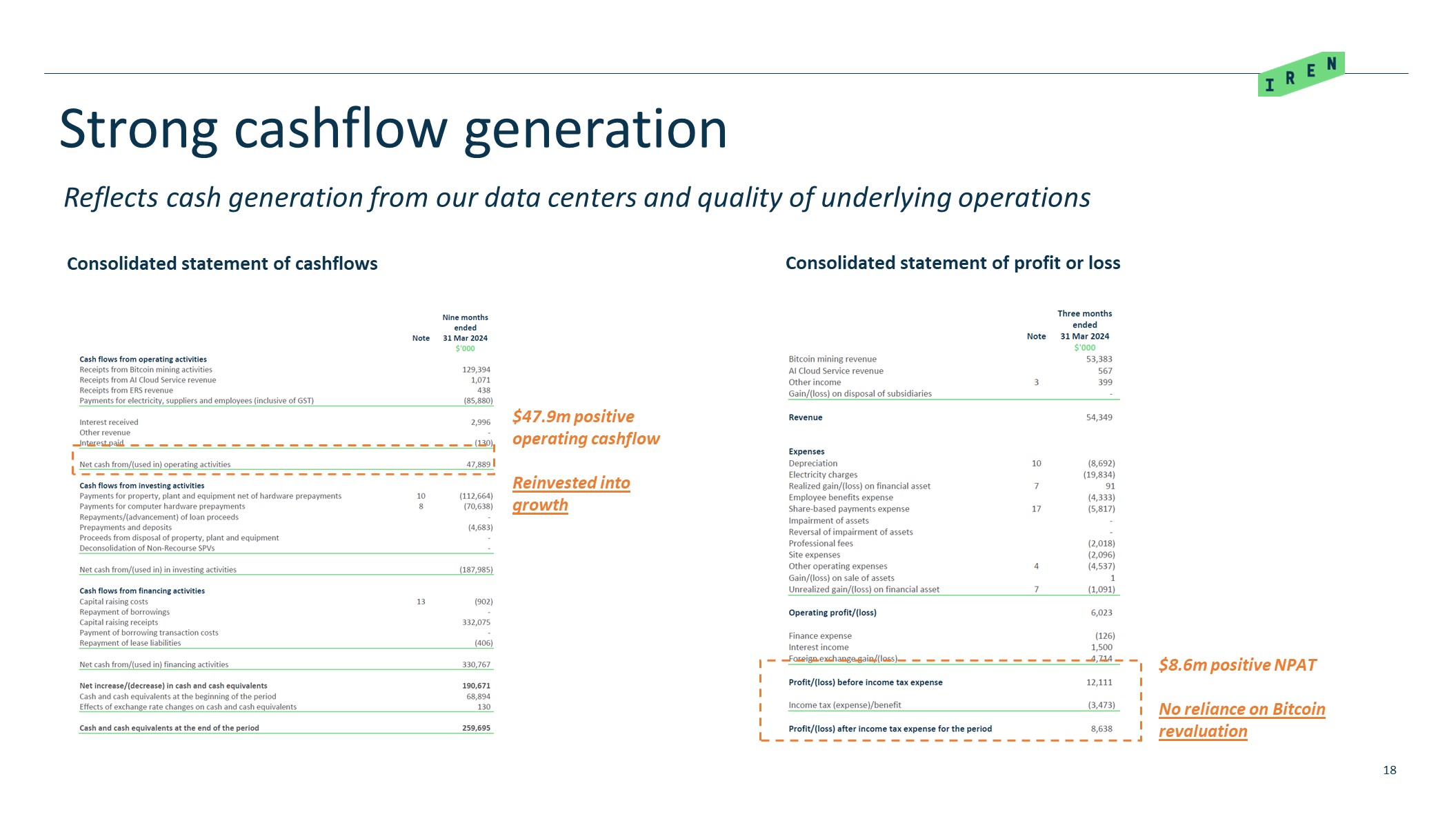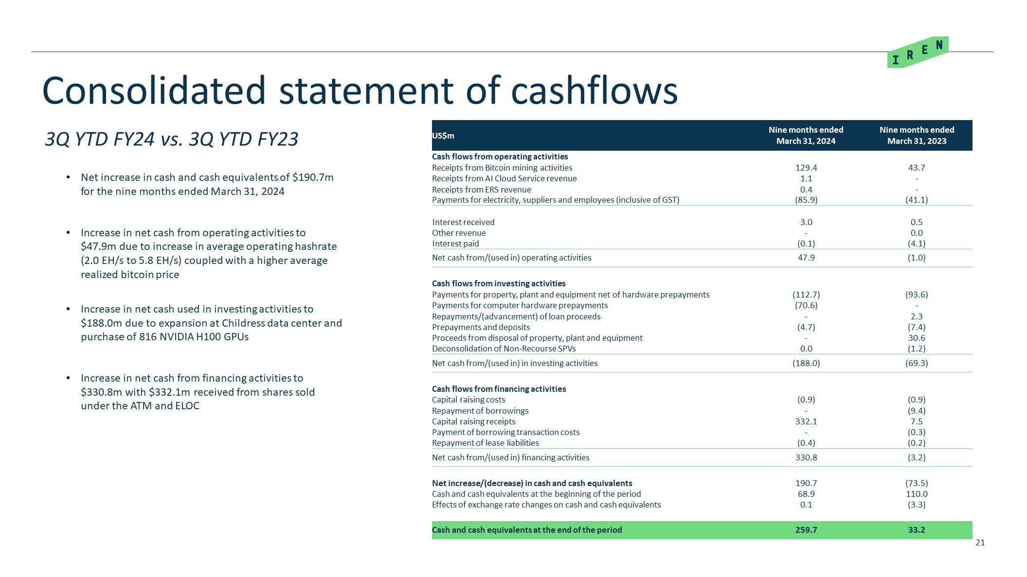 Consolidated statement of cashflows  21  Net increase in cash and cash equivalents of $190.7m for the nine months ended March 31, 2024  Increase in net cash from operating activities to $47.9m due to increase in average operating hashrate (2.0 EH/s to 5.8 EH/s) coupled with a higher average realized bitcoin price   Increase in net cash used in investing activities to $188.0m due to expansion at Childress data center and purchase of 816 NVIDIA H100 GPUs  Increase in net cash from financing activities to $330.8m with $332.1m received from shares sold under the ATM and ELOC  3Q YTD FY24 vs. 3Q YTD FY23   US$m  Nine months ended March 31, 2024  Nine months ended March 31, 2023  Cash flows from operating activities  Receipts from Bitcoin mining activities  129.4  43.7  Receipts from AI Cloud Service revenue  1.1  -  Receipts from ERS revenue  0.4  -  Payments for electricity, suppliers and employees (inclusive of GST)  (85.9)  (41.1)  Interest received  3.0  0.5  Other revenue  -  0.0  Interest paid  (0.1)  (4.1)  Net cash from/(used in) operating activities  47.9  (1.0)  Cash flows from investing activities  Payments for property, plant and equipment net of hardware prepayments  (112.7)  (93.6)  Payments for computer hardware prepayments  (70.6)  -  Repayments/(advancement) of loan proceeds  -  2.3  Prepayments and deposits  (4.7)  (7.4)  Proceeds from disposal of property, plant and equipment  -  30.6  Deconsolidation of Non-Recourse SPVs  0.0  (1.2)  Net cash from/(used in) in investing activities  (188.0)  (69.3)  Cash flows from financing activities  Capital raising costs  (0.9)  (0.9)  Repayment of borrowings  -  (9.4)  Capital raising receipts  332.1  7.5  Payment of borrowing transaction costs  -  (0.3)  Repayment of lease liabilities  (0.4)  (0.2)  Net cash from/(used in) financing activities  330.8  (3.2)  Net increase/(decrease) in cash and cash equivalents  190.7  (73.5)  Cash and cash equivalents at the beginning of the period  68.9  110.0  Effects of exchange rate changes on cash and cash equivalents  0.1  (3.3)  Cash and cash equivalents at the end of the period  259.7  33.2