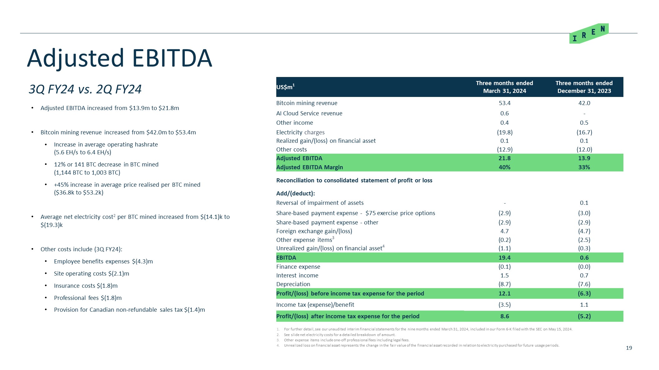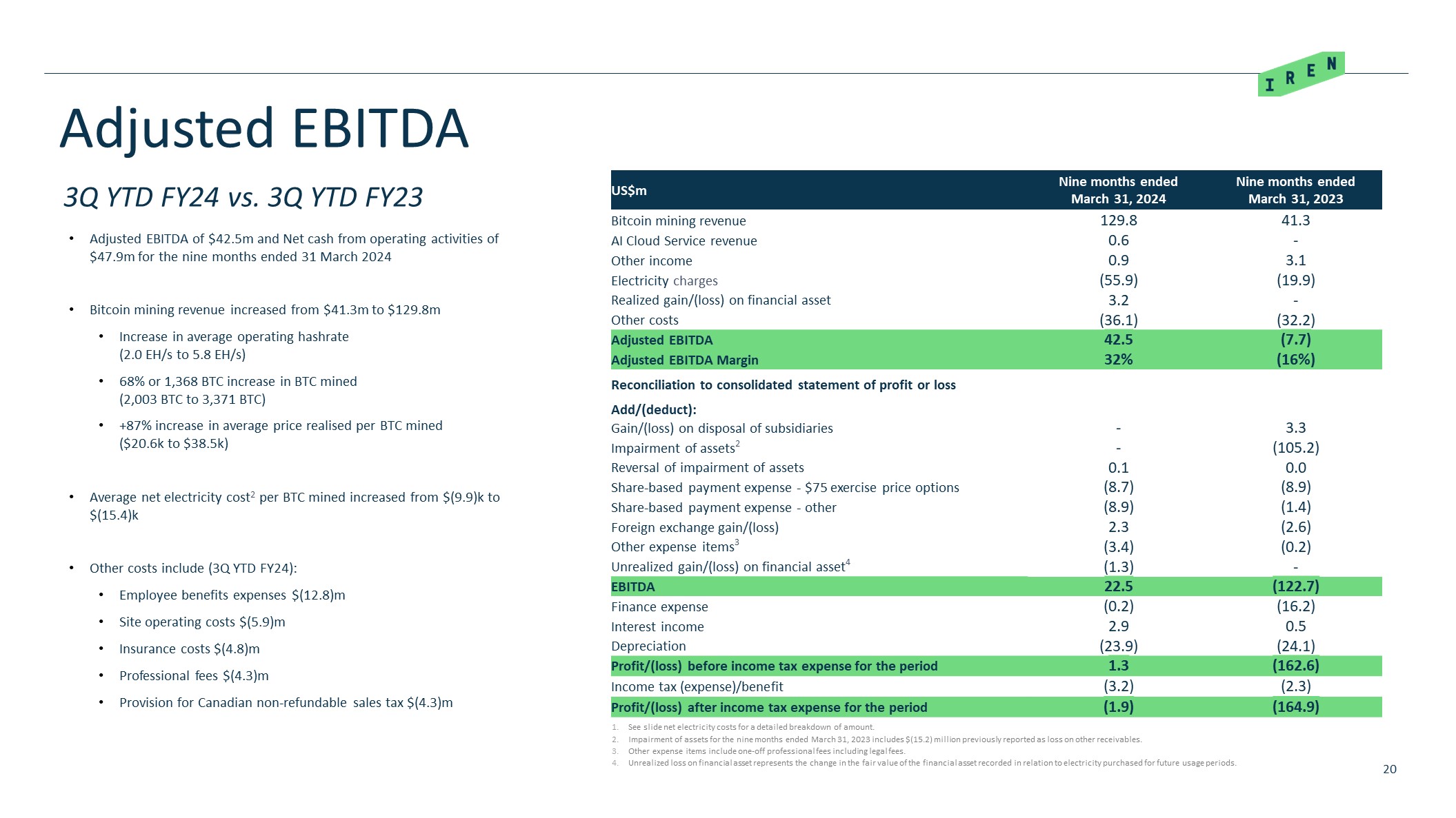 Adjusted EBITDA  19  3Q FY24 vs. 2Q FY24  US$m1  Three months ended March 31, 2024  Three months ended December 31, 2023  Bitcoin mining revenue  53.4  42.0  AI Cloud Service revenue  0.6  -  Other income  0.4  0.5  Electricity charges  (19.8)  (16.7)  Realized gain/(loss) on financial asset  0.1  0.1  Other costs  (12.9)  (12.0)  Adjusted EBITDA  21.8  13.9  Adjusted EBITDA Margin  40%  33%  Reconciliation to consolidated statement of profit or loss  Add/(deduct):  Reversal of impairment of assets  -  0.1  Share-based payment expense -  $75 exercise price options  (2.9)  (3.0)  Share-based payment expense - other  (2.9)  (2.9)  Foreign exchange gain/(loss)  4.7  (4.7)  Other expense items3  (0.2)  (2.5)  Unrealized gain/(loss) on financial asset4  (1.1)  (0.3)  EBITDA  19.4  0.6  Finance expense  (0.1)  (0.0)  Interest income  1.5  0.7  Depreciation  (8.7)  (7.6)  Profit/(loss) before income tax expense for the period  12.1  (6.3)  Income tax (expense)/benefit  (3.5)  1.1  Profit/(loss) after income tax expense for the period  8.6  (5.2)  Adjusted EBITDA increased from $13.9m to $21.8m  Bitcoin mining revenue increased from $42.0m to $53.4m  Increase in average operating hashrate (5.6 EH/s to 6.4 EH/s)  12% or 141 BTC decrease in BTC mined(1,144 BTC to 1,003 BTC)  +45% increase in average price realised per BTC mined($36.8k to $53.2k)  Average net electricity cost2 per BTC mined increased from $(14.1)k to $(19.3)k  Other costs include (3Q FY24):  Employee benefits expenses $(4.3)m   Site operating costs $(2.1)m   Insurance costs $(1.8)m  Professional fees $(1.8)m  Provision for Canadian non-refundable sales tax $(1.4)m   For further detail, see our unaudited interim financial statements for the nine months ended March 31, 2024, included in our Form 6-K filed with the SEC on May 15, 2024.  See slide net electricity costs for a detailed breakdown of amount.   Other expense items include one-off professional fees including legal fees.  Unrealized loss on financial asset represents the change in the fair value of the financial asset recorded in relation to electricity purchased for future usage periods.