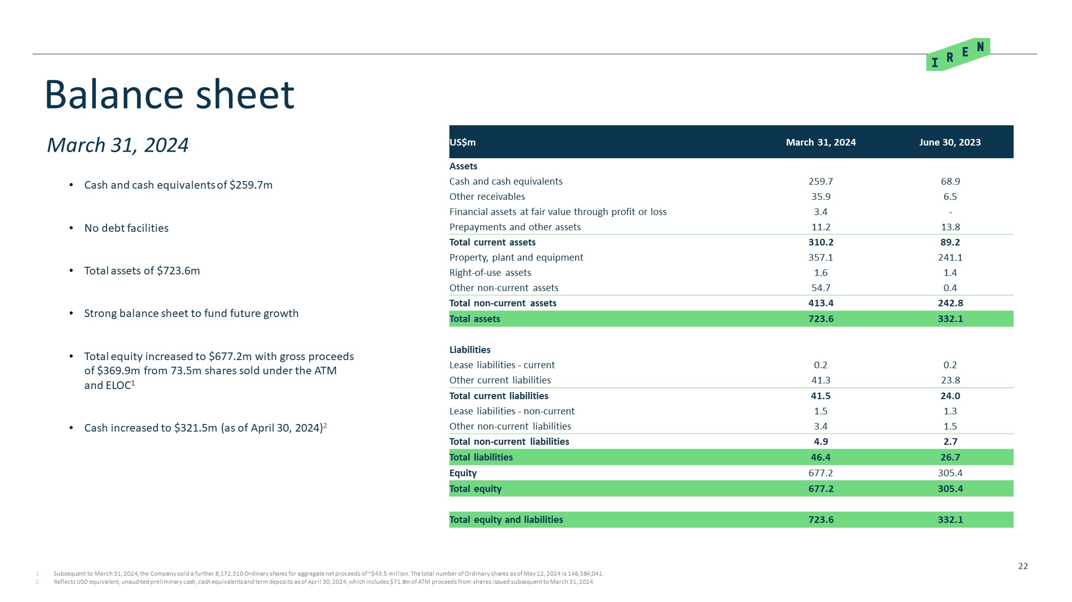Balance sheet  22  March 31, 2024  US$m  March 31, 2024  June 30, 2023  Assets  Cash and cash equivalents  259.7  68.9  Other receivables  35.9  6.5  Financial assets at fair value through profit or loss  3.4  -  Prepayments and other assets  11.2  13.8  Total current assets  310.2  89.2  Property, plant and equipment  357.1  241.1  Right-of-use assets  1.6  1.4  Other non-current assets  54.7  0.4  Total non-current assets  413.4  242.8  Total assets  723.6  332.1  Liabilities  Lease liabilities - current  0.2  0.2  Other current liabilities  41.3  23.8  Total current liabilities  41.5  24.0  Lease liabilities - non-current  1.5  1.3  Other non-current liabilities  3.4  1.5  Total non-current liabilities  4.9  2.7  Total liabilities  46.4  26.7  Equity  677.2  305.4  Total equity  677.2  305.4  Total equity and liabilities  723.6  332.1  Cash and cash equivalents of $259.7m  No debt facilities  Total assets of $723.6m  Strong balance sheet to fund future growth  Total equity increased to $677.2m with gross proceeds of $369.9m from 73.5m shares sold under the ATM and ELOC1  Cash increased to $321.5m (as of April 30, 2024)2  Subsequent to March 31, 2024, the Company sold a further 8,172,310 Ordinary shares for aggregate net proceeds of ~$43.5 million. The total number of Ordinary shares as of May 12, 2024 is 146,584,041.  Reflects USD equivalent, unaudited preliminary cash, cash equivalents and term deposits as of April 30, 2024, which includes $71.8m of ATM proceeds from shares issued subsequent to March 31, 2024.