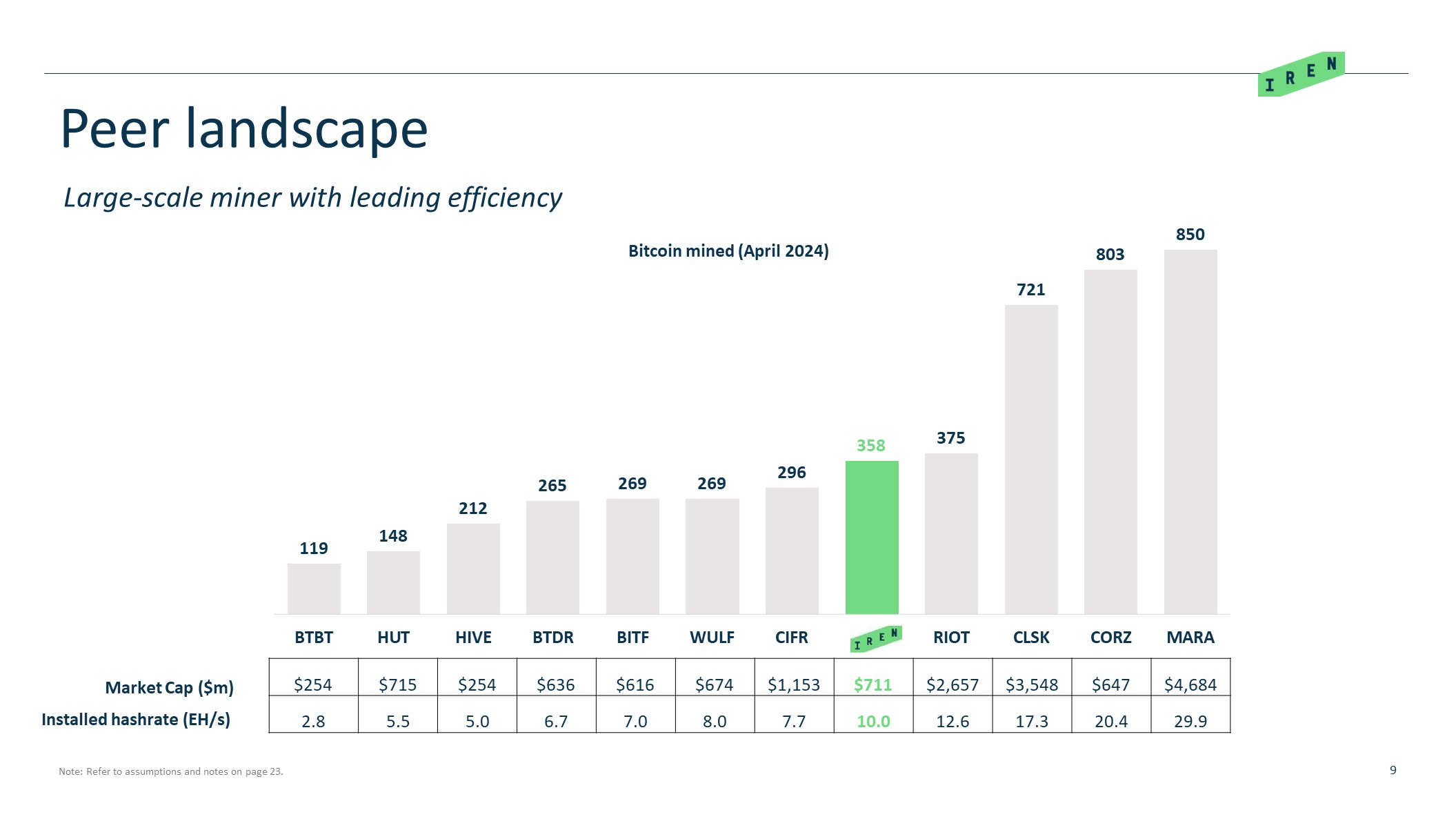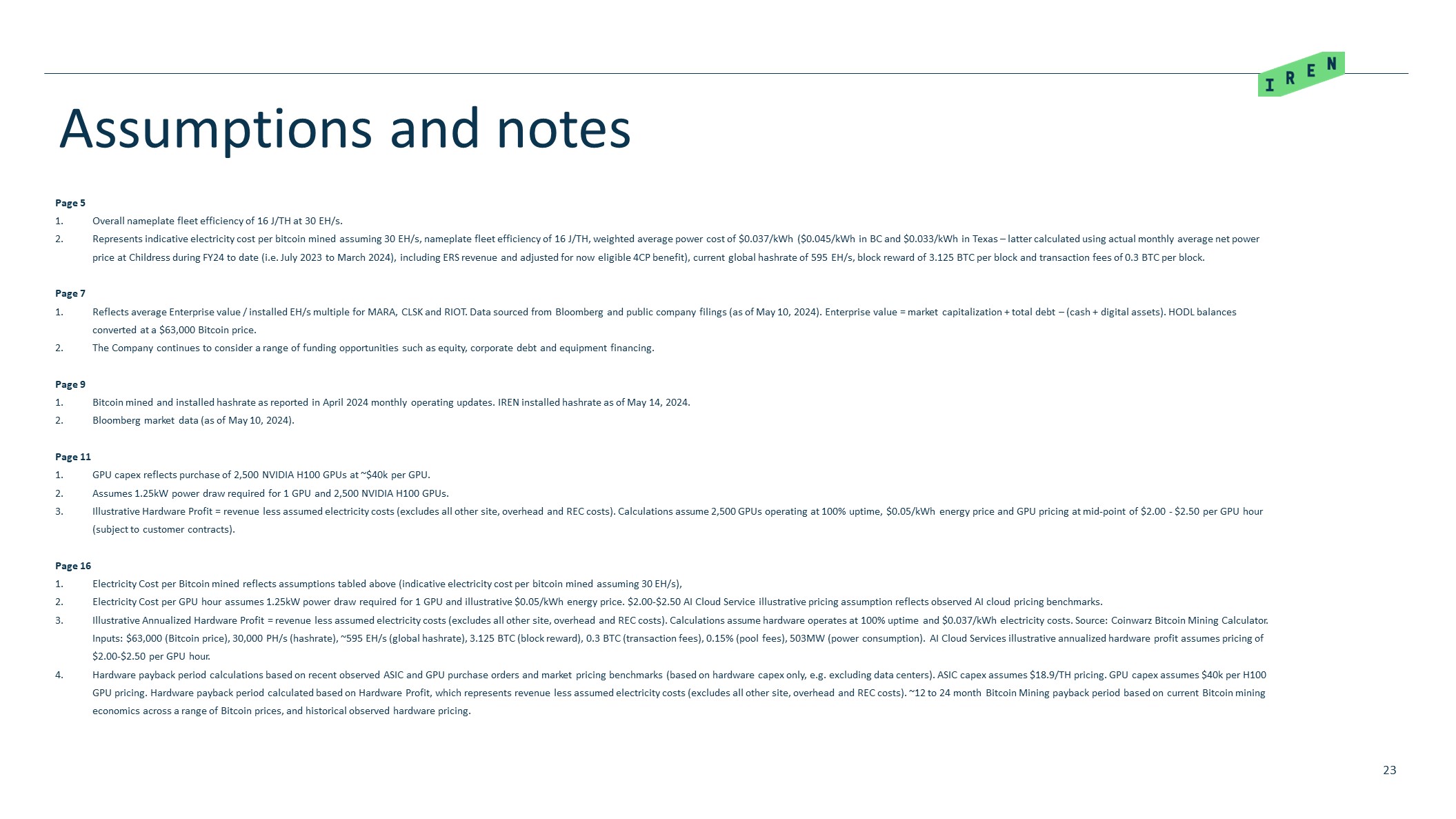 Assumptions and notes  23  Page 5  Overall nameplate fleet efficiency of 16 J/TH at 30 EH/s.  Represents indicative electricity cost per bitcoin mined assuming 30 EH/s, nameplate fleet efficiency of 16 J/TH, weighted average power cost of $0.037/kWh ($0.045/kWh in BC and $0.033/kWh in Texas – latter calculated using actual monthly average net power price at Childress during FY24 to date (i.e. July 2023 to March 2024), including ERS revenue and adjusted for now eligible 4CP benefit), current global hashrate of 595 EH/s, block reward of 3.125 BTC per block and transaction fees of 0.3 BTC per block.  Page 7  Reflects average Enterprise value / installed EH/s multiple for MARA, CLSK and RIOT. Data sourced from Bloomberg and public company filings (as of May 10, 2024). Enterprise value = market capitalization + total debt – (cash + digital assets). HODL balances converted at a $63,000 Bitcoin price.  The Company continues to consider a range of funding opportunities such as equity, corporate debt and equipment financing.  Page 9  Bitcoin mined and installed hashrate as reported in April 2024 monthly operating updates. IREN installed hashrate as of May 14, 2024.  Bloomberg market data (as of May 10, 2024).  Page 11  GPU capex reflects purchase of 2,500 NVIDIA H100 GPUs at ~$40k per GPU.  Assumes 1.25kW power draw required for 1 GPU and 2,500 NVIDIA H100 GPUs.  Illustrative Hardware Profit = revenue less assumed electricity costs (excludes all other site, overhead and REC costs). Calculations assume 2,500 GPUs operating at 100% uptime, $0.05/kWh energy price and GPU pricing at mid-point of $2.00 - $2.50 per GPU hour (subject to customer contracts).   Page 16  Electricity Cost per Bitcoin mined reflects assumptions tabled above (indicative electricity cost per bitcoin mined assuming 30 EH/s),   Electricity Cost per GPU hour assumes 1.25kW power draw required for 1 GPU and illustrative $0.05/kWh energy price. $2.00-$2.50 AI Cloud Service illustrative pricing assumption reflects observed AI cloud pricing benchmarks.  Illustrative Annualized Hardware Profit = revenue less assumed electricity costs (excludes all other site, overhead and REC costs). Calculations assume hardware operates at 100% uptime and $0.037/kWh electricity costs. Source: Coinwarz Bitcoin Mining Calculator. Inputs: $63,000 (Bitcoin price), 30,000 PH/s (hashrate), ~595 EH/s (global hashrate), 3.125 BTC (block reward), 0.3 BTC (transaction fees), 0.15% (pool fees), 503MW (power consumption). AI Cloud Services illustrative annualized hardware profit assumes pricing of $2.00-$2.50 per GPU hour.  Hardware payback period calculations based on recent observed ASIC and GPU purchase orders and market pricing benchmarks (based on hardware capex only, e.g. excluding data centers). ASIC capex assumes $18.9/TH pricing. GPU capex assumes $40k per H100 GPU pricing. Hardware payback period calculated based on Hardware Profit, which represents revenue less assumed electricity costs (excludes all other site, overhead and REC costs). ~12 to 24 month Bitcoin Mining payback period based on current Bitcoin mining economics across a range of Bitcoin prices, and historical observed hardware pricing.