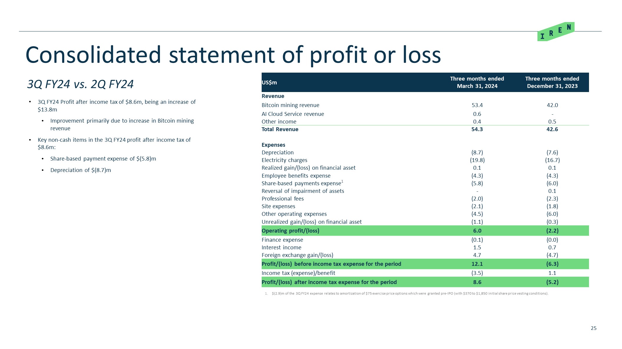 Consolidated statement of profit or loss  25  3Q FY24 vs. 2Q FY24  US$m  Three months ended March 31, 2024  Three months ended December 31, 2023  Revenue  Bitcoin mining revenue  53.4  42.0  AI Cloud Service revenue  0.6  -  Other income  0.4  0.5  Total Revenue  54.3  42.6  Expenses  Depreciation  (8.7)  (7.6)  Electricity charges  (19.8)  (16.7)  Realized gain/(loss) on financial asset  0.1  0.1  Employee benefits expense  (4.3)  (4.3)  Share-based payments expense1  (5.8)  (6.0)  Reversal of impairment of assets  -  0.1  Professional fees  (2.0)  (2.3)  Site expenses  (2.1)  (1.8)  Other operating expenses  (4.5)  (6.0)  Unrealized gain/(loss) on financial asset  (1.1)  (0.3)  Operating profit/(loss)  6.0  (2.2)  Finance expense  (0.1)  (0.0)  Interest income  1.5  0.7  Foreign exchange gain/(loss)  4.7  (4.7)  Profit/(loss) before income tax expense for the period  12.1  (6.3)  Income tax (expense)/benefit  (3.5)  1.1  Profit/(loss) after income tax expense for the period  8.6  (5.2)  3Q FY24 Profit after income tax of $8.6m, being an increase of $13.8m  Improvement primarily due to increase in Bitcoin mining revenue  Key non-cash items in the 3Q FY24 profit after income tax of $8.6m:  Share-based payment expense of $(5.8)m  Depreciation of $(8.7)m  $(2.9)m of the 3Q FY24 expense relates to amortization of $75 exercise price options which were granted pre-IPO (with $370 to $1,850 initial share price vesting conditions).