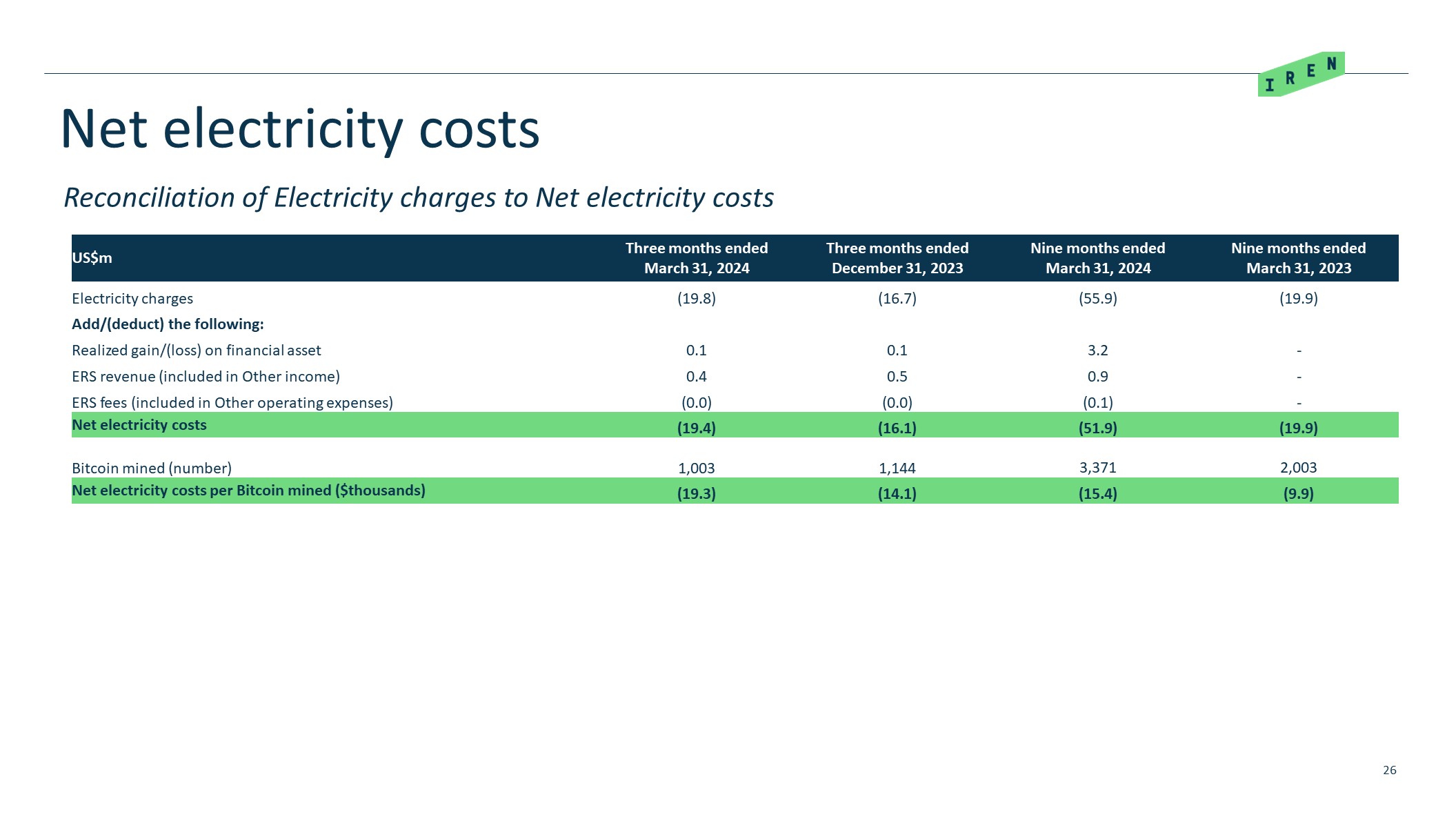 Net electricity costs   26  Reconciliation of Electricity charges to Net electricity costs   US$m  Three months ended March 31, 2024  Three months ended December 31, 2023  Nine months ended March 31, 2024  Nine months ended March 31, 2023  Electricity charges  (19.8)  (16.7)  (55.9)  (19.9)  Add/(deduct) the following:   Realized gain/(loss) on financial asset  0.1  0.1  3.2  -  ERS revenue (included in Other income)   0.4  0.5  0.9  -  ERS fees (included in Other operating expenses)  (0.0)  (0.0)  (0.1)  -  Net electricity costs   (19.4)  (16.1)  (51.9)  (19.9)  Bitcoin mined (number)  1,003   1,144    3,371    2,003   Net electricity costs per Bitcoin mined ($thousands)  (19.3)  (14.1)  (15.4)  (9.9)