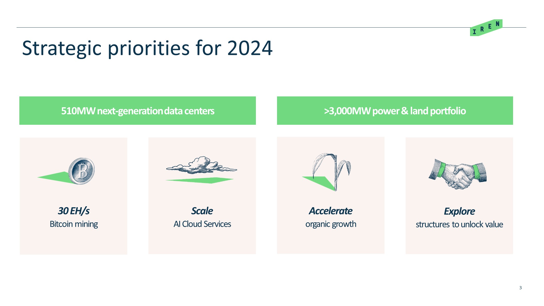 Strategic priorities for 2024   3  510MW next-generation data centers  >3,000MW power & land portfolio  30 EH/s   Bitcoin mining  Scale   AI Cloud Services  Accelerate  organic growth  Explore   structures to unlock value