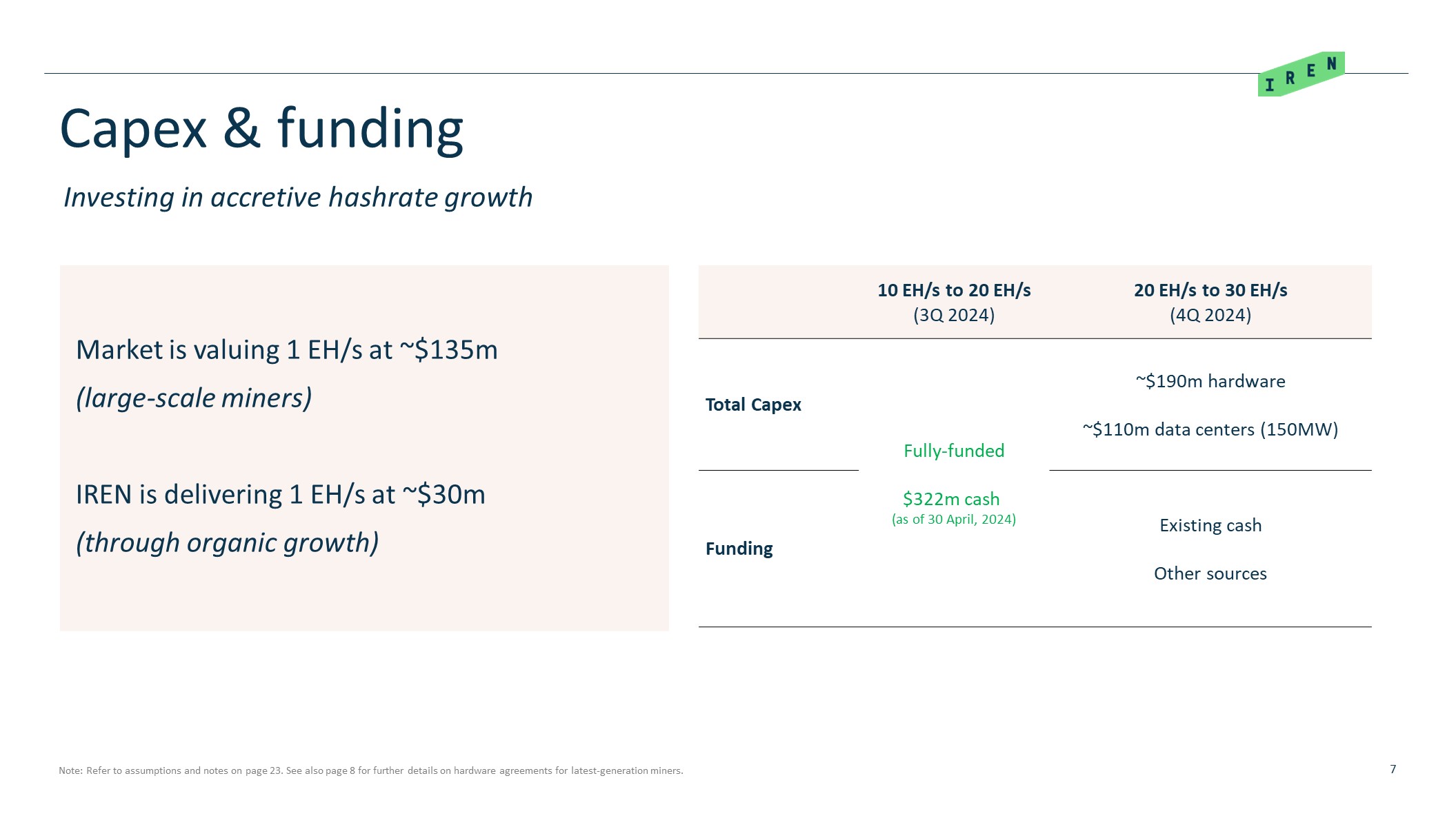 Capex & funding  7  Market is valuing 1 EH/s at ~$135m  (large-scale miners)  IREN is delivering 1 EH/s at ~$30m  (through organic growth)  10 EH/s to 20 EH/s  (3Q 2024)  20 EH/s to 30 EH/s  (4Q 2024)  Total Capex  Fully-funded  $322m cash   (as of 30 April, 2024)  ~$190m hardware  ~$110m data centers (150MW)  Funding  Existing cash  Other sources  Investing in accretive hashrate growth  Note: Refer to assumptions and notes on page 23. See also page 8 for further details on hardware agreements for latest-generation miners.
