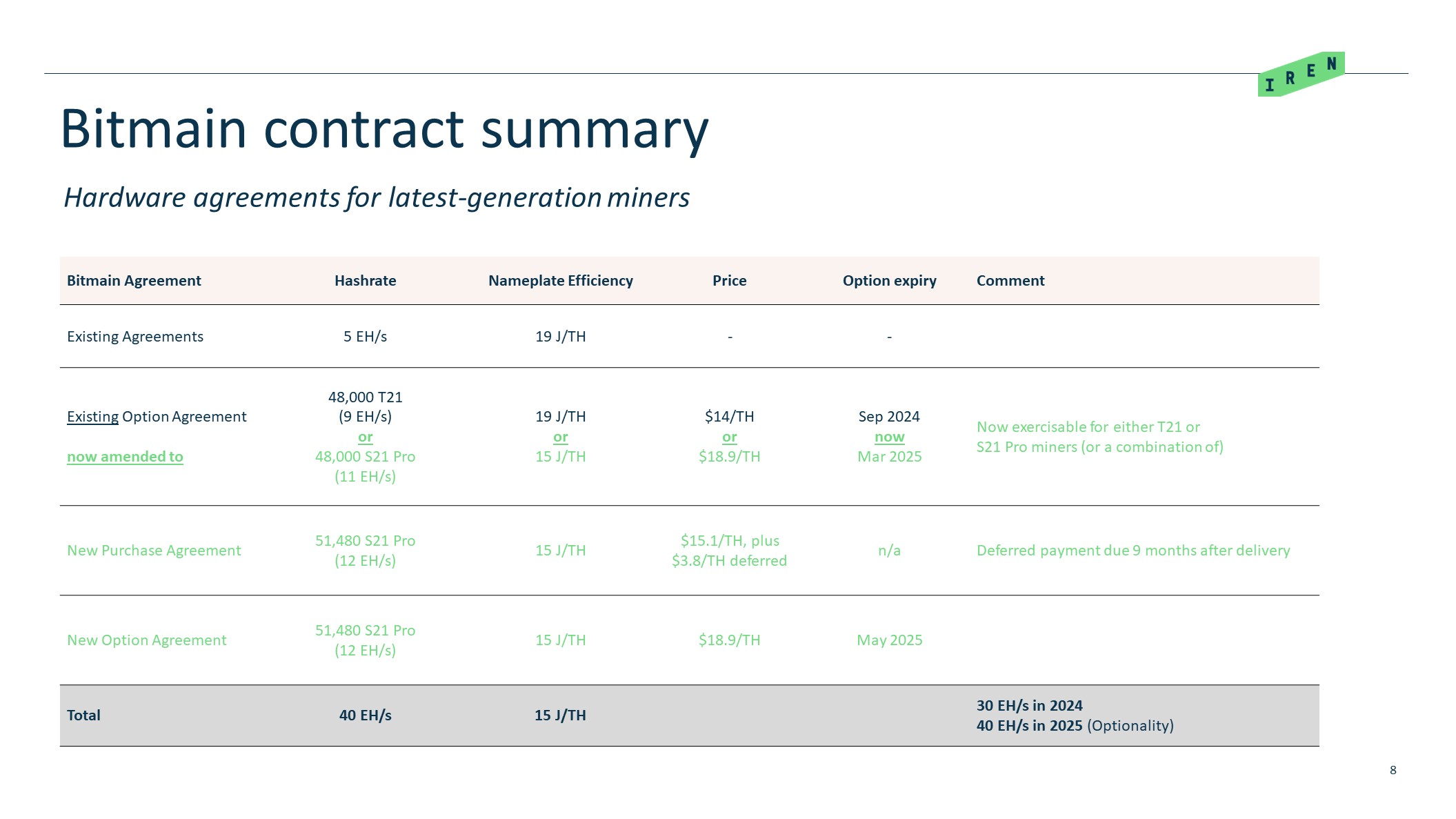 Bitmain contract summary  8  Hardware agreements for latest-generation miners  Bitmain Agreement  Hashrate  Nameplate Efficiency  Price  Option expiry  Comment  Existing Agreements  5 EH/s  19 J/TH  -  -  Existing Option Agreement  now amended to  48,000 T21  (9 EH/s)  or  48,000 S21 Pro   (11 EH/s)  19 J/TH  or  15 J/TH  $14/TH  or  $18.9/TH  Sep 2024  now  Mar 2025  Now exercisable for either T21 or   S21 Pro miners (or a combination of)  New Purchase Agreement  51,480 S21 Pro  (12 EH/s)  15 J/TH  $15.1/TH, plus  $3.8/TH deferred  n/a  Deferred payment due 9 months after delivery  New Option Agreement  51,480 S21 Pro  (12 EH/s)  15 J/TH  $18.9/TH  May 2025  Total  40 EH/s  15 J/TH  30 EH/s in 2024  40 EH/s in 2025 (Optionality)