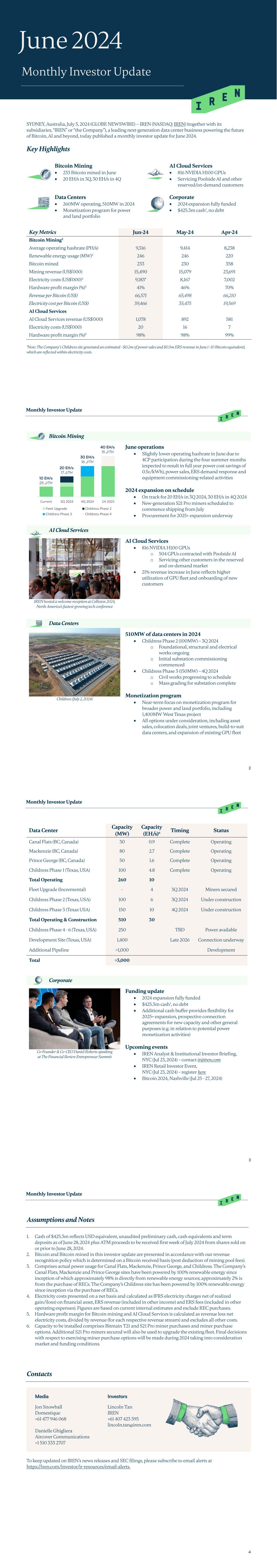 SYDNEY, Australia, July 5, 2024 (GLOBE NEWSWIRE) -- IREN (NASDAQ: IREN) (together with its subsidiaries, “IREN” or “the Company”), a leading next-generation data center business powering the future of Bitcoin, AI and beyond, today published a monthly investor update for June 2024. Key Highlights Bitcoin Mining AI Cloud Services • 233 Bitcoin mined in June • 20 EH/s in 3Q, 30 EH/s in 4Q • 816 NVIDIA H100 GPUs • Servicing Poolside AI and other reserved/on-demand customers Data Centers Corporate • 260MW operating, 510MW in 2024 • Monetization program for power and land portfolio • 2024 expansion fully funded • $425.3m cash1, no debt Key Metrics Jun-24 May-24 Apr-24 Bitcoin Mining2 Average operating hashrate (PH/s) 9,316 9,414 8,238 Renewable energy usage (MW)3 246 246 220 Bitcoin mined 233 230 358 Mining revenue (US$'000) 15,490 15,079 23,691 Electricity costs (US$'000)4 9,183* 8,167 7,002 Hardware profit margin (%)5 41% 46% 70% Revenue per Bitcoin (US$) 66,571 65,498 66,210 Electricity cost per Bitcoin (US$) 39,466 35,475 19,569 AI Cloud Services AI Cloud Services revenue (US$'000) 1,078 892 581 Electricity costs (US$'000) 20 16 7 Hardware profit margin (%)5 98% 98% 99% *Note: The Company’s Childress site generated an estimated ~$0.2m of power sales and $0.5m ERS revenue in June (~10 Bitcoin equivalent), which are reflected within electricity costs. June 2024 Monthly Investor Update Monthly Investor Update 2 Bitcoin Mining June operations • Slightly lower operating hashrate in June due to 4CP participation during the four summer months (expected to result in full year power cost savings of 0.5c/kWh), power sales, ERS demand response and equipment commissioning-related activities 2024 expansion on schedule • On track for 20 EH/s in 3Q 2024, 30 EH/s in 4Q 2024 • New-generation S21 Pro miners scheduled to commence shipping from July • Procurement for 2025+ expansion underway AI Cloud Services IREN hosted a welcome reception at Collision 2024, North America’s fastest-growing tech conference AI Cloud Services • 816 NVIDIA H100 GPUs o 504 GPUs contracted with Poolside AI o Servicing other customers in the reserved and on-demand market • 21% revenue increase in June reflects higher utilization of GPU fleet and onboarding of new customers Data Centers Childress (July 2, 2024) 510MW of data centers in 2024 • Childress Phase 2 (100MW) – 3Q 2024 o Foundational, structural and electrical works ongoing o Initial substation commissioning commenced • Childress Phase 3 (150MW) – 4Q 2024 o Civil works progressing to schedule o Mass grading for substation complete Monetization program • Near-term focus on monetization program for broader power and land portfolio, including 1,400MW West Texas project • All options under consideration, including asset sales, colocation deals, joint ventures, build-to-suit data centers, and expansion of existing GPU fleet Current 3Q 2024 4Q 2024 1H 2025 Fleet Upgrade Childress Phase 2 Childress Phase 3 Childress Phase 4 30 EH/s 16 J/TH 40 EH/s 15 J/TH 10 EH/s 25 J/TH 20 EH/s 17 J/TH Monthly Investor Update 3 Data Center Capacity (MW) Capacity (EH/s)6 Timing Status Canal Flats (BC, Canada) 30 0.9 Complete Operating Mackenzie (BC, Canada) 80 2.7 Complete Operating Prince George (BC, Canada) 50 1.6 Complete Operating Childress Phase 1 (Texas, USA) 100 4.8 Complete Operating Total Operating 260 10 Fleet Upgrade (Incremental) - 4 3Q 2024 Miners secured Childress Phase 2 (Texas, USA) 100 6 3Q 2024 Under construction Childress Phase 3 (Texas USA) 150 10 4Q 2024 Under construction Total Operating & Construction 510 30 Childress Phase 4 - 6 (Texas, USA) 250 TBD Power available Development Site (Texas, USA) 1,400 Late 2026 Connection underway Additional Pipeline >1,000 Development Total >3,000 Corporate Co-Founder & Co-CEO Daniel Roberts speaking at The Financial Review Entrepreneur Summit Funding update • 2024 expansion fully funded • $425.3m cash1, no debt • Additional cash buffer provides flexibility for 2025+ expansion, prospective connection agreements for new capacity and other general purposes (e.g. in relation to potential power monetization activities) Upcoming events • IREN Analyst & Institutional Investor Briefing, NYC (Jul 23, 2024) – contact ir@iren.com • IREN Retail Investor Event, NYC (Jul 23, 2024) – register here • Bitcoin 2024, Nashville (Jul 25 - 27, 2024) Monthly Investor Update 4 Assumptions and Notes 1. Cash of $425.3m reflects USD equivalent, unaudited preliminary cash, cash equivalents and term deposits as of June 28, 2024 plus ATM proceeds to be received first week of July 2024 from shares sold on or prior to June 28, 2024. 2. Bitcoin and Bitcoin mined in this investor update are presented in accordance with our revenue recognition policy which is determined on a Bitcoin received basis (post deduction of mining pool fees). 3. Comprises actual power usage for Canal Flats, Mackenzie, Prince George, and Childress. The Company’s Canal Flats, Mackenzie and Prince George sites have been powered by 100% renewable energy since inception of which approximately 98% is directly from renewable energy sources; approximately 2% is from the purchase of RECs. The Company’s Childress site has been powered by 100% renewable energy since inception via the purchase of RECs. 4. Electricity costs presented on a net basis and calculated as IFRS electricity charges net of realized gain/(loss) on financial asset, ERS revenue (included in other income) and ERS fees (included in other operating expenses). Figures are based on current internal estimates and exclude REC purchases. 5. Hardware profit margin for Bitcoin mining and AI Cloud Services is calculated as revenue less net electricity costs, divided by revenue (for each respective revenue stream) and excludes all other costs. 6. Capacity to be installed comprises Bitmain T21 and S21 Pro miner purchases and miner purchase options. Additional S21 Pro miners secured