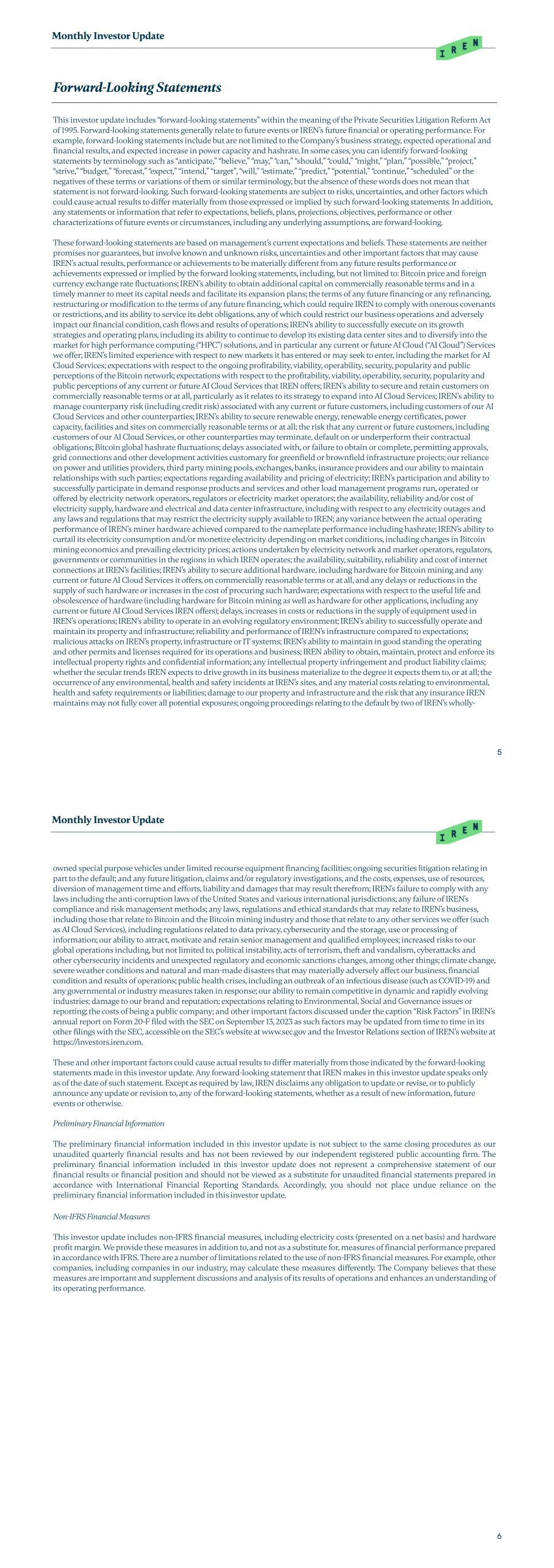 Monthly Investor Update 5 Forward-Looking Statements This investor update includes “forward-looking statements” within the meaning of the Private Securities Litigation Reform Act of 1995. Forward-looking statements generally relate to future events or IREN’s future financial or operating performance. For example, forward-looking statements include but are not limited to the Company’s business strategy, expected operational and financial results, and expected increase in power capacity and hashrate. In some cases, you can identify forward-looking statements by terminology such as “anticipate,” “believe,” “may,” “can,” “should,” “could,” “might,” “plan,” “possible,” “project,” “strive,” “budget,” “forecast,” “expect,” “intend,” “target”, “will,” “estimate,” “predict,” “potential,” “continue,” “scheduled” or the negatives of these terms or variations of them or similar terminology, but the absence of these words does not mean that statement is not forward-looking. Such forward-looking statements are subject to risks, uncertainties, and other factors which could cause actual results to differ materially from those expressed or implied by such forward-looking statements. In addition, any statements or information that refer to expectations, beliefs, plans, projections, objectives, performance or other characterizations of future events or circumstances, including any underlying assumptions, are forward-looking. These forward-looking statements are based on management’s current expectations and beliefs. These statements are neither promises nor guarantees, but involve known and unknown risks, uncertainties and other important factors that may cause IREN’s actual results, performance or achievements to be materially different from any future results performance or achievements expressed or implied by the forward looking statements, including, but not limited to: Bitcoin price and foreign currency exchange rate fluctuations; IREN’s ability to obtain additional capital on commercially reasonable terms and in a timely manner to meet its capital needs and facilitate its expansion plans; the terms of any future financing or any refinancing, restructuring or modification to the terms of any future financing, which could require IREN to comply with onerous covenants or restrictions, and its ability to service its debt obligations, any of which could restrict our business operations and adversely impact our financial condition, cash flows and results of operations; IREN’s ability to successfully execute on its growth strategies and operating plans, including its ability to continue to develop its existing data center sites and to diversify into the market for high performance computing (“HPC”) solutions, and in particular any current or future AI Cloud (“AI Cloud”) Services we offer; IREN’s limited experience with respect to new markets it has entered or may seek to enter, including the market for AI Cloud Services; expectations with respect to the ongoing profitability, viability, operability, security, popularity and public perceptions of the Bitcoin network; expectations with respect to the profitability, viability, operability, security, popularity and public perceptions of any current or future AI Cloud Services that IREN offers; IREN’s ability to secure and retain customers on commercially reasonable terms or at all, particularly as it relates to its strategy to expand into AI Cloud Services; IREN’s ability to manage counterparty risk (including credit risk) associated with any current or future customers, including customers of our AI Cloud Services and other counterparties; IREN’s ability to secure renewable energy, renewable energy certificates, power capacity, facilities and sites on commercially reasonable terms or at all; the risk that any current or future customers, including customers of our AI Cloud Services, or other counterparties may terminate, default on or underperform their contractual obligations; Bitcoin global hashrate fluctuations; delays associated with, or failure to obtain or complete, permitting approvals, grid connections and other development activities customary for greenfield or brownfield infrastructure projects; our reliance on power and utilities providers, third party mining pools, exchanges, banks, insurance providers and our ability to maintain relationships with such parties; expectations regarding availability and pricing of electricity; IREN’s participation and ability to successfully participate in demand response products and services and other load management programs run, operated or offered by electricity network operators, regulators or electricity market operators; the availability, reliability and/or cost of electricity supply, hardware and electrical and data center infrastructure, including with respect to any electricity outages and any laws and regulations that may restrict the electricity supply available to IREN; any variance between the actual operating performance of IREN’s miner hardware achieved compared to the nameplate performance including hashrate; IREN’s ability to curtail its electricity consumption and/or monetize electricity depending on market conditions, including changes in Bitcoin mining economics and prevailing electricity prices; actions undertaken by electricity network and market operators, regulators, governments or communities in the regions in which IREN operates; the availability, suitability, reliability and cost of internet connections at IREN’s facilities; IREN’s ability to secure additional hardware, including hardware for Bitcoin mining and any current or future AI Cloud Services it offers, on commercially reasonable terms or at all, and any delays or reductions in the supply of such hardware or increases in the cost of procuring such hardware; expectations with respect to the useful life a
