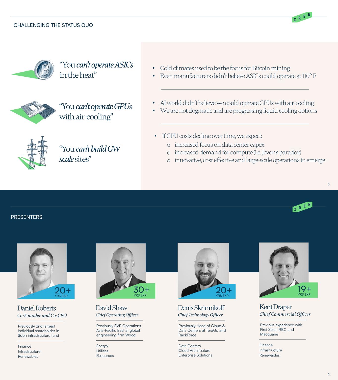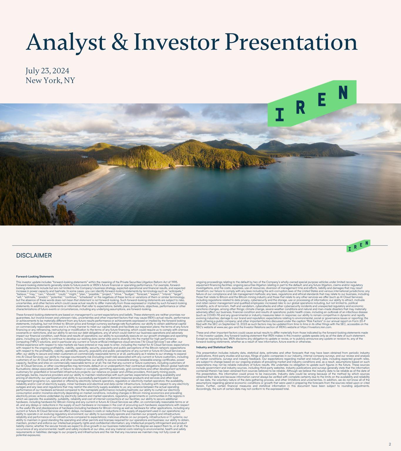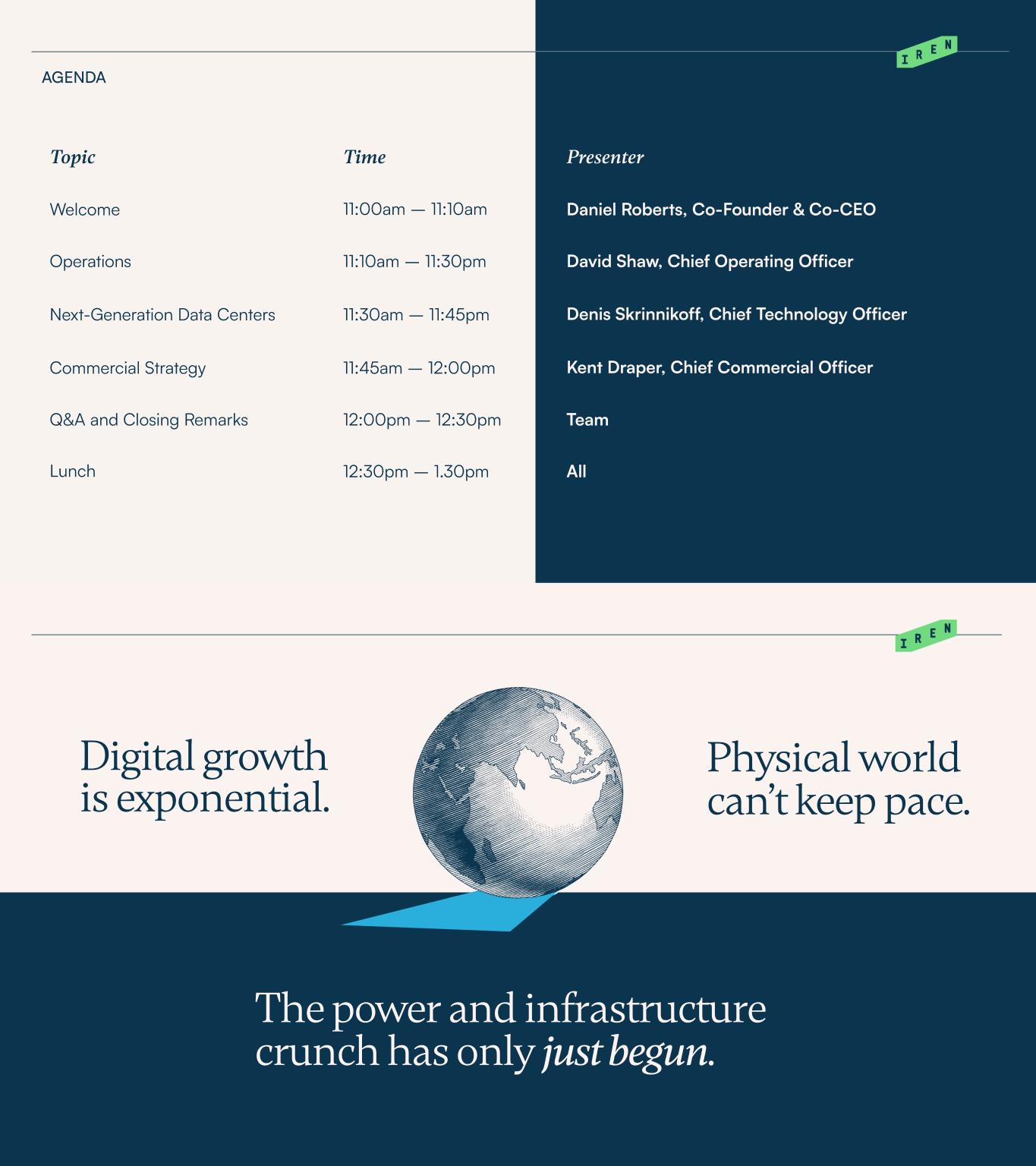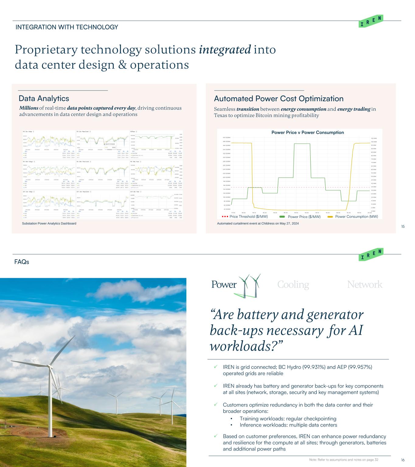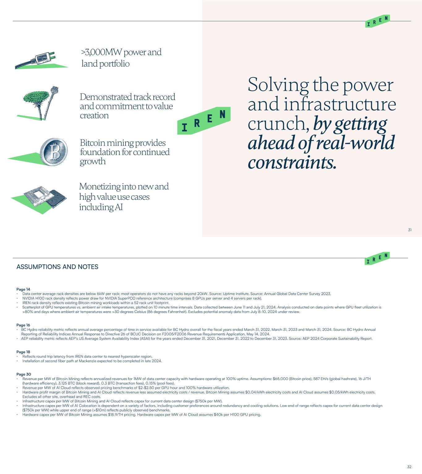 Design for IREN’s Texas Tier 3 Data Center • • THE ABOVE INFORMATION IS FOR GENERAL INFORMATION AND ILLUSTRATIVE PURPOSES ONLY. THE BITCOIN MINING, AI CLOUD SERVICES AND AI COLOCATION ANNUAL REVENUE PER MW, HARDWARE PROFIT MARGIN, INFRASTRCUTURE CPAEX PER MW AND HARDWARE CAPEX PER MW OUTPUTS ARE FOR ILLUSTRATIVE PURPOSES ONLY AND SHOULD NOT BE CONSIDERED PROJECTIONS OF IREN’S OPERATING PERFORMANCE. SUCH OUTPUTS ARE BASED ON IMPORTANT ASSUMPTIONS AND HISTORICAL INFORMATION, INCLUDING INFORMATION AND CALCULATIONS FROM THIRD PARTY SOURCES (INCLUDING WEBSITES). WE HAVE NOT INDEPENDENTLY VERIFIED SUCH INFORMATION AND CALCULATIONS, AND SUCH INFORMATION AND CALCULATIONS ARE SUBJECT TO IMPORTANT LIMITATIONS AND COULD PROVE TO BE INACCURATE. THE ILLUSTRATIVE OUTPUTS ARE BASED ON HISTORICAL OR THIRD-PARTY INFORMATION WHICH MAY OR MAY NOT MATERIALIZE IN THE FUTURE (INCLUDING THE ABILITY TO CONTRACT CUSTOMERS AT SUCH PRICING, OR AT ALL) – ACCORDINGLY, THERE IS NO ASSURANCE THAT ANY ILLUSTRATIVE OUTPUTS WILL BE ACHIEVED WITHIN THE TIMEFRAMES PRESENTED OR AT ALL OR THAT HARDWARE WILL OPERATE AT 100% UPTIME. THE ILLUSTRATIVE OUTPUTS ASSUME HARDWARE IS FULLY INSTALLED AND OPERATING TODAY USING THE ABOVE ASSUMPTIONS. THESE ASSUMPTIONS ARE LIKELY TO BE DIFFERENT IN THE FUTURE AND USERS SHOULD INPUT THEIR OWN ASSUMPTIONS. THE ABOVE AND THIS PRESENTATION SHOULD BE READ STRICTLY IN CONJUNCTION WITH THE FORWARD-LOOKING STATEMENTS DISCLAIMER ON PAGE 2.