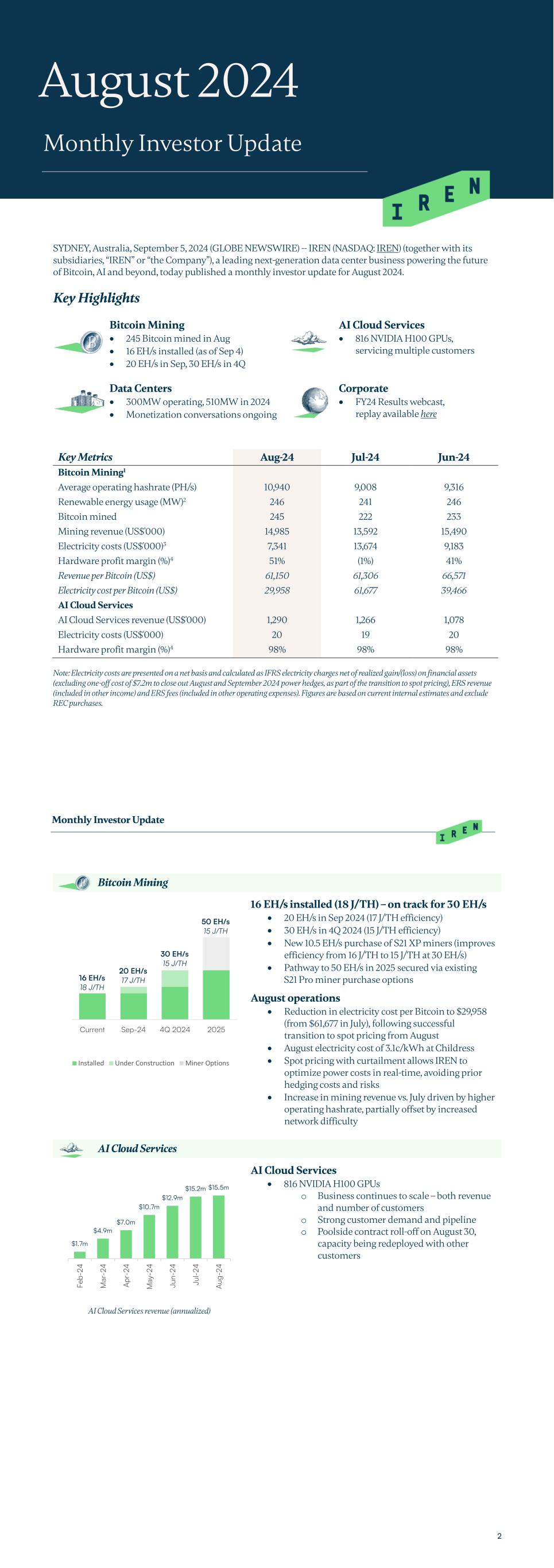 SYDNEY, Australia, September 5, 2024 (GLOBE NEWSWIRE) -- IREN (NASDAQ: IREN) (together with its subsidiaries, “IREN” or “the Company”), a leading next-generation data center business powering the future of Bitcoin, AI and beyond, today published a monthly investor update for August 2024. Key Highlights Bitcoin Mining AI Cloud Services • 245 Bitcoin mined in Aug • 16 EH/s installed (as of Sep 4) • 20 EH/s in Sep, 30 EH/s in 4Q • 816 NVIDIA H100 GPUs, servicing multiple customers Data Centers Corporate • 300MW operating, 510MW in 2024 • Monetization conversations ongoing • FY24 Results webcast, replay available here Key Metrics Aug-24 Jul-24 Jun-24 Bitcoin Mining1 Average operating hashrate (PH/s) 10,940 9,008 9,316 Renewable energy usage (MW)2 246 241 246 Bitcoin mined 245 222 233 Mining revenue (US$'000) 14,985 13,592 15,490 Electricity costs (US$'000)3 7,341 13,674 9,183 Hardware profit margin (%)4 51% (1%) 41% Revenue per Bitcoin (US$) 61,150 61,306 66,571 Electricity cost per Bitcoin (US$) 29,958 61,677 39,466 AI Cloud Services AI Cloud Services revenue (US$'000) 1,290 1,266 1,078 Electricity costs (US$'000) 20 19 20 Hardware profit margin (%)4 98% 98% 98% Note: Electricity costs are presented on a net basis and calculated as IFRS electricity charges net of realized gain/(loss) on financial assets (excluding one-off cost of $7.2m to close out August and September 2024 power hedges, as part of the transition to spot pricing), ERS revenue (included in other income) and ERS fees (included in other operating expenses). Figures are based on current internal estimates and exclude REC purchases. August 2024 Monthly Investor Update Monthly Investor Update 2 Bitcoin Mining 16 EH/s installed (18 J/TH) – on track for 30 EH/s • 20 EH/s in Sep 2024 (17 J/TH efficiency) • 30 EH/s in 4Q 2024 (15 J/TH efficiency) • New 10.5 EH/s purchase of S21 XP miners (improves efficiency from 16 J/TH to 15 J/TH at 30 EH/s) • Pathway to 50 EH/s in 2025 secured via existing S21 Pro miner purchase options August operations • Reduction in electricity cost per Bitcoin to $29,958 (from $61,677 in July), following successful transition to spot pricing from August • August electricity cost of 3.1c/kWh at Childress • Spot pricing with curtailment allows IREN to optimize power costs in real-time, avoiding prior hedging costs and risks • Increase in mining revenue vs. July driven by higher operating hashrate, partially offset by increased network difficulty AI Cloud Services AI Cloud Services • 816 NVIDIA H100 GPUs o Business continues to scale – both revenue and number of customers o Strong customer demand and pipeline o Poolside contract roll-off on August 30, capacity being redeployed with other customers AI Cloud Services revenue (annualized) Current Sep-24 4Q 2024 2025 Installed Under Construction Miner Options 30 EH/s 15 J/TH 50 EH/s 15 J/TH 16 EH/s 18 J/TH 20 EH/s 17 J/TH $1.7m $4.9m $7.0m $10.7m $12.9m $15.2m $15.5m Fe b- 24 M ar -2 4 A pr -2 4 M ay -2 4 Ju n- 24 Ju l- 24 A ug -2 4