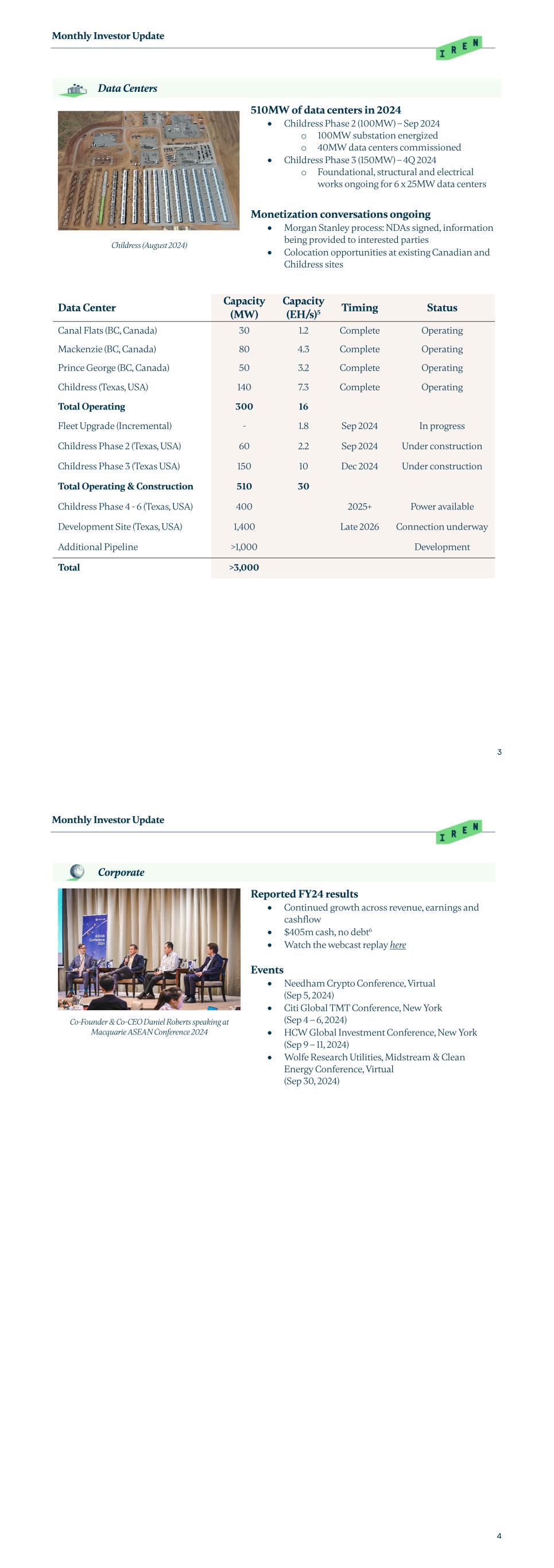 Monthly Investor Update 3 Data Centers Childress (August 2024) 510MW of data centers in 2024 • Childress Phase 2 (100MW) – Sep 2024 o 100MW substation energized o 40MW data centers commissioned • Childress Phase 3 (150MW) – 4Q 2024 o Foundational, structural and electrical works ongoing for 6 x 25MW data centers Monetization conversations ongoing • Morgan Stanley process: NDAs signed, information being provided to interested parties • Colocation opportunities at existing Canadian and Childress sites Data Center Capacity (MW) Capacity (EH/s)5 Timing Status Canal Flats (BC, Canada) 30 1.2 Complete Operating Mackenzie (BC, Canada) 80 4.3 Complete Operating Prince George (BC, Canada) 50 3.2 Complete Operating Childress (Texas, USA) 140 7.3 Complete Operating Total Operating 300 16 Fleet Upgrade (Incremental) - 1.8 Sep 2024 In progress Childress Phase 2 (Texas, USA) 60 2.2 Sep 2024 Under construction Childress Phase 3 (Texas USA) 150 10 Dec 2024 Under construction Total Operating & Construction 510 30 Childress Phase 4 - 6 (Texas, USA) 400 2025+ Power available Development Site (Texas, USA) 1,400 Late 2026 Connection underway Additional Pipeline >1,000 Development Total >3,000 Monthly Investor Update 4 Corporate Co-Founder & Co-CEO Daniel Roberts speaking at Macquarie ASEAN Conference 2024 Reported FY24 results • Continued growth across revenue, earnings and cashflow • $405m cash, no debt6 • Watch the webcast replay here Events • Needham Crypto Conference, Virtual (Sep 5, 2024) • Citi Global TMT Conference, New York (Sep 4 – 6, 2024) • HCW Global Investment Conference, New York (Sep 9 – 11, 2024) • Wolfe Research Utilities, Midstream & Clean Energy Conference, Virtual (Sep 30, 2024)