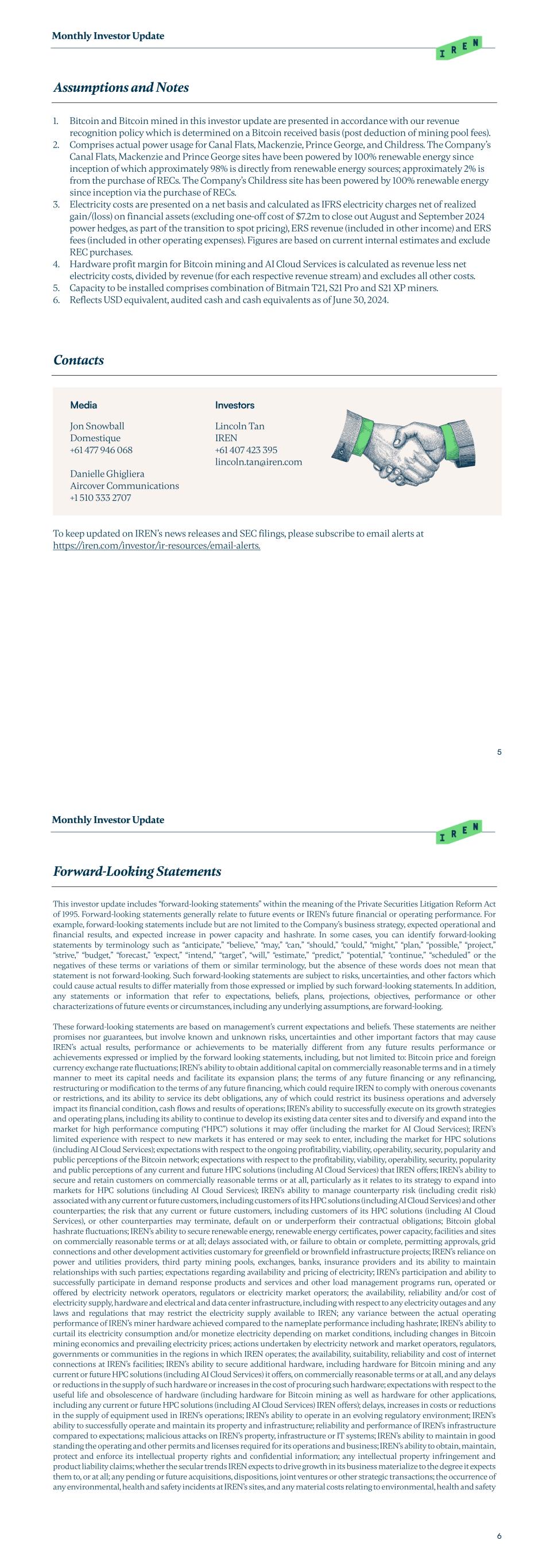 Monthly Investor Update 5 Assumptions and Notes 1. Bitcoin and Bitcoin mined in this investor update are presented in accordance with our revenue recognition policy which is determined on a Bitcoin received basis (post deduction of mining pool fees). 2. Comprises actual power usage for Canal Flats, Mackenzie, Prince George, and Childress. The Company’s Canal Flats, Mackenzie and Prince George sites have been powered by 100% renewable energy since inception of which approximately 98% is directly from renewable energy sources; approximately 2% is from the purchase of RECs. The Company’s Childress site has been powered by 100% renewable energy since inception via the purchase of RECs. 3. Electricity costs are presented on a net basis and calculated as IFRS electricity charges net of realized gain/(loss) on financial assets (excluding one-off cost of $7.2m to close out August and September 2024 power hedges, as part of the transition to spot pricing), ERS revenue (included in other income) and ERS fees (included in other operating expenses). Figures are based on current internal estimates and exclude REC purchases. 4. Hardware profit margin for Bitcoin mining and AI Cloud Services is calculated as revenue less net electricity costs, divided by revenue (for each respective revenue stream) and excludes all other costs. 5. Capacity to be installed comprises combination of Bitmain T21, S21 Pro and S21 XP miners. 6. Reflects USD equivalent, audited cash and cash equivalents as of June 30, 2024. Contacts Media Jon Snowball Domestique +61 477 946 068 Danielle Ghigliera Aircover Communications +1 510 333 2707 Investors Lincoln Tan IREN +61 407 423 395 lincoln.tan@iren.com To keep updated on IREN’s news releases and SEC filings, please subscribe to email alerts at https://iren.com/investor/ir-resources/email-alerts. Monthly Investor Update 6 Forward-Looking Statements This investor update includes “forward-looking statements” within the meaning of the Private Securities Litigation Reform Act of 1995. Forward-looking statements generally relate to future events or IREN’s future financial or operating performance. For example, forward-looking statements include but are not limited to the Company’s business strategy, expected operational and financial results, and expected increase in power capacity and hashrate. In some cases, you can identify forward-looking statements by terminology such as “anticipate,” “believe,” “may,” “can,” “should,” “could,” “might,” “plan,” “possible,” “project,” “strive,” “budget,” “forecast,” “expect,” “intend,” “target”, “will,” “estimate,” “predict,” “potential,” “continue,” “scheduled” or the negatives of these terms or variations of them or similar terminology, but the absence of these words does not mean that statement is not forward-looking. Such forward-looking statements are subject to risks, uncertainties, and other factors which could cause actual results to differ materially from those expressed or implied by such forward-looking statements. In addition, any statements or information that refer to expectations, beliefs, plans, projections, objectives, performance or other characterizations of future events or circumstances, including any underlying assumptions, are forward-looking. These forward-looking statements are based on management’s current expectations and beliefs. These statements are neither promises nor guarantees, but involve known and unknown risks, uncertainties and other important factors that may cause IREN’s actual results, performance or achievements to be materially different from any future results performance or achievements expressed or implied by the forward looking statements, including, but not limited to: Bitcoin price and foreign currency exchange rate fluctuations; IREN’s ability to obtain additional capital on commercially reasonable terms and in a timely manner to meet its capital needs and facilitate its expansion plans; the terms of any future financing or any refinancing, restructuring or modification to the terms of any future financing, which could require IREN to comply with onerous covenants or restrictions, and its ability to service its debt obligations, any of which could restrict its business operations and adversely impact its financial condition, cash flows and results of operations; IREN’s ability to successfully execute on its growth strategies and operating plans, including its ability to continue to develop its existing data center sites and to diversify and expand into the market for high performance computing (“HPC”) solutions it may offer (including the market for AI Cloud Services); IREN’s limited experience with respect to new markets it has entered or may seek to enter, including the market for HPC solutions (including AI Cloud Services); expectations with respect to the ongoing profitability, viability, operability, security, popularity and public perceptions of the Bitcoin network; expectations with respect to the profitability, viability, operability, security, popularity and public perceptions of any current and future HPC solutions (including AI Cloud Services) that IREN offers; IREN’s ability to secure and retain customers on commercially reasonable terms or at all, particularly as it relates to its strategy to expand into markets for HPC solutions (including AI Cloud Services); IREN’s ability to manage counterparty risk (including credit risk) associated with any current or future customers, including customers of its HPC solutions (including AI Cloud Services) and other counterparties; the risk that any current or future customers, including customers of its HPC solutions (including AI Cloud Services), or other counterparties may terminate, default on or underperform their contractual obligations; Bitcoin global hashrate fluctuations; IREN’s ability to secure renewable energy, renewab