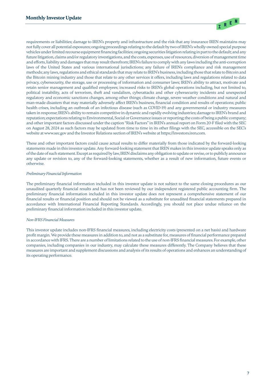 Monthly Investor Update 7 requirements or liabilities; damage to IREN’s property and infrastructure and the risk that any insurance IREN maintains may not fully cover all potential exposures; ongoing proceedings relating to the default by two of IREN’s wholly-owned special purpose vehicles under limited recourse equipment financing facilities; ongoing securities litigation relating in part to the default; and any future litigation, claims and/or regulatory investigations, and the costs, expenses, use of resources, diversion of management time and efforts, liability and damages that may result therefrom; IREN's failure to comply with any laws including the anti-corruption laws of the United States and various international jurisdictions; any failure of IREN's compliance and risk management methods; any laws, regulations and ethical standards that may relate to IREN’s business, including those that relate to Bitcoin and the Bitcoin mining industry and those that relate to any other services it offers, including laws and regulations related to data privacy, cybersecurity, the storage, use or processing of information and consumer laws; IREN’s ability to attract, motivate and retain senior management and qualified employees; increased risks to IREN’s global operations including, but not limited to, political instability, acts of terrorism, theft and vandalism, cyberattacks and other cybersecurity incidents and unexpected regulatory and economic sanctions changes, among other things; climate change, severe weather conditions and natural and man-made disasters that may materially adversely affect IREN’s business, financial condition and results of operations; public health crises, including an outbreak of an infectious disease (such as COVID-19) and any governmental or industry measures taken in response; IREN’s ability to remain competitive in dynamic and rapidly evolving industries; damage to IREN’s brand and reputation; expectations relating to Environmental, Social or Governance issues or reporting; the costs of being a public company; and other important factors discussed under the caption “Risk Factors” in IREN’s annual report on Form 20-F filed with the SEC on August 28, 2024 as such factors may be updated from time to time in its other filings with the SEC, accessible on the SEC’s website at www.sec.gov and the Investor Relations section of IREN’s website at https://investors.iren.com. These and other important factors could cause actual results to differ materially from those indicated by the forward-looking statements made in this investor update. Any forward-looking statement that IREN makes in this investor update speaks only as of the date of such statement. Except as required by law, IREN disclaims any obligation to update or revise, or to publicly announce any update or revision to, any of the forward-looking statements, whether as a result of new information, future events or otherwise. Preliminary Financial Information The preliminary financial information included in this investor update is not subject to the same closing procedures as our unaudited quarterly financial results and has not been reviewed by our independent registered public accounting firm. The preliminary financial information included in this investor update does not represent a comprehensive statement of our financial results or financial position and should not be viewed as a substitute for unaudited financial statements prepared in accordance with International Financial Reporting Standards. Accordingly, you should not place undue reliance on the preliminary financial information included in this investor update. Non-IFRS Financial Measures This investor update includes non-IFRS financial measures, including electricity costs (presented on a net basis) and hardware profit margin. We provide these measures in addition to, and not as a substitute for, measures of financial performance prepared in accordance with IFRS. There are a number of limitations related to the use of non-IFRS financial measures. For example, other companies, including companies in our industry, may calculate these measures differently. The Company believes that these measures are important and supplement discussions and analysis of its results of operations and enhances an understanding of its operating performance.