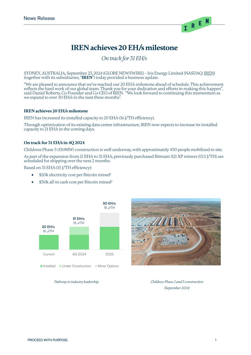 PROCEED WITH PURPOSE. 1 IREN achieves 20 EH/s milestone On track for 31 EH/s SYDNEY, AUSTRALIA, September 23, 2024 (GLOBE NEWSWIRE) – Iris Energy Limited (NASDAQ: IREN) (together with its subsidiaries, “IREN”) today provided a business update. “We are pleased to announce that we’ve reached our 20 EH/s milestone ahead of schedule. This achievement reflects the hard work of our global team. Thank you for your dedication and efforts in making this happen”, said Daniel Roberts, Co-Founder and Co-CEO of IREN. “We look forward to continuing this momentum as we expand to over 30 EH/s in the next three months”. IREN achieves 20 EH/s milestone IREN has increased its installed capacity to 20 EH/s (16 J/TH efficiency). Through optimization of its existing data center infrastructure, IREN now expects to increase its installed capacity to 21 EH/s in the coming days. On track for 31 EH/s in 4Q 2024 Childress Phase 3 (150MW) construction is well underway, with approximately 430 people mobilized to site. As part of the expansion from 21 EH/s to 31 EH/s, previously purchased Bitmain S21 XP miners (13.5 J/TH) are scheduled for shipping over the next 2 months. Based on 31 EH/s (15 J/TH efficiency): • $20k electricity cost per Bitcoin mined1 • $30k all-in cash cost per Bitcoin mined2 Pathway to industry leadership Childress Phase 2 and 3 construction (September 2024) Current 4Q 2024 2025 Installed Under Construction Miner Options 31 EH/s 15 J/TH 50 EH/s 15 J/TH 20 EH/s 16 J/TH