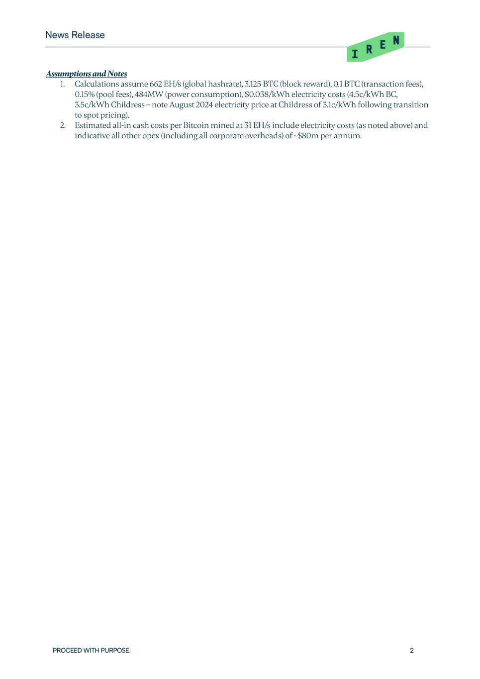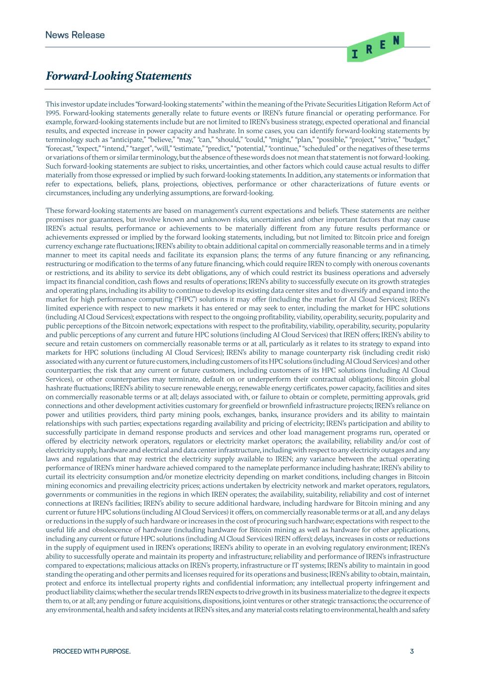 PROCEED WITH PURPOSE. 4 requirements or liabilities; damage to IREN’s property and infrastructure and the risk that any insurance IREN maintains may not fully cover all potential exposures; ongoing proceedings relating to the default by two of IREN’s wholly-owned special purpose vehicles under limited recourse equipment financing facilities; ongoing securities litigation relating in part to the default; and any future litigation, claims and/or regulatory investigations, and the costs, expenses, use of resources, diversion of management time and efforts, liability and damages that may result therefrom; IREN's failure to comply with any laws including the anti-corruption laws of the United States and various international jurisdictions; any failure of IREN's compliance and risk management methods; any laws, regulations and ethical standards that may relate to IREN’s business, including those that relate to Bitcoin and the Bitcoin mining industry and those that relate to any other services it offers, including laws and regulations related to data privacy, cybersecurity, the storage, use or processing of information and consumer laws; IREN’s ability to attract, motivate and retain senior management and qualified employees; increased risks to IREN’s global operations including, but not limited to, political instability, acts of terrorism, theft and vandalism, cyberattacks and other cybersecurity incidents and unexpected regulatory and economic sanctions changes, among other things; climate change, severe weather conditions and natural and man-made disasters that may materially adversely affect IREN’s business, financial condition and results of operations; public health crises, including an outbreak of an infectious disease (such as COVID-19) and any governmental or industry measures taken in response; IREN’s ability to remain competitive in dynamic and rapidly evolving industries; damage to IREN’s brand and reputation; expectations relating to Environmental, Social or Governance issues or reporting; the costs of being a public company; and other important factors discussed under the caption “Risk Factors” in IREN’s annual report on Form 20-F filed with the SEC on August 28, 2024 as such factors may be updated from time to time in its other filings with the SEC, accessible on the SEC’s website at www.sec.gov and the Investor Relations section of IREN’s website at https://investors.iren.com. These and other important factors could cause actual results to differ materially from those indicated by the forward-looking statements made in this investor update. Any forward-looking statement that IREN makes in this investor update speaks only as of the date of such statement. Except as required by law, IREN disclaims any obligation to update or revise, or to publicly announce any update or revision to, any of the forward-looking statements, whether as a result of new information, future events or otherwise. Non-IFRS Financial Measures This investor update includes non-IFRS financial measures, including electricity costs (presented on a net basis). We provide these measures in addition to, and not as a substitute for, measures of financial performance prepared in accordance with IFRS. There are a number of limitations related to the use of non-IFRS financial measures. For example, other companies, including companies in our industry, may calculate these measures differently. IREN believes that these measures are important and supplement discussions and analysis of its results of operations and enhances an understanding of its operating performance. Electricity costs are calculated as our IFRS Electricity charges net of Realized gain/(loss) on financial asset, ERS revenue (included in Other income) and ERS fees (included in Other operating expenses), and excludes the cost of RECs.