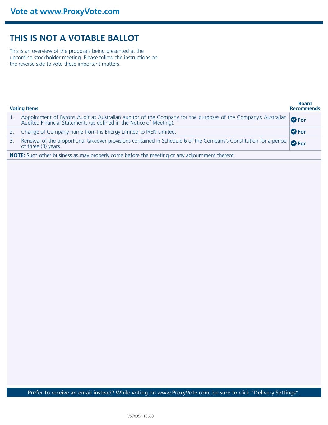 Vote at www.ProxyVote.com Prefer to receive an email instead? While voting on www.ProxyVote.com, be sure to click “Delivery Settings”. Voting Items Board Recommends V57835-P18663 THIS IS NOT A VOTABLE BALLOT This is an overview of the proposals being presented at the upcoming stockholder meeting. Please follow the instructions on the reverse side to vote these important matters. 1. Appointment of Byrons Audit as Australian auditor of the Company for the purposes of the Company’s Australian Audited Financial Statements (as defined in the Notice of Meeting). For 2. Change of Company name from Iris Energy Limited to IREN Limited. For 3. Renewal of the proportional takeover provisions contained in Schedule 6 of the Company’s Constitution for a period of three (3) years. For NOTE: Such other business as may properly come before the meeting or any adjournment thereof.