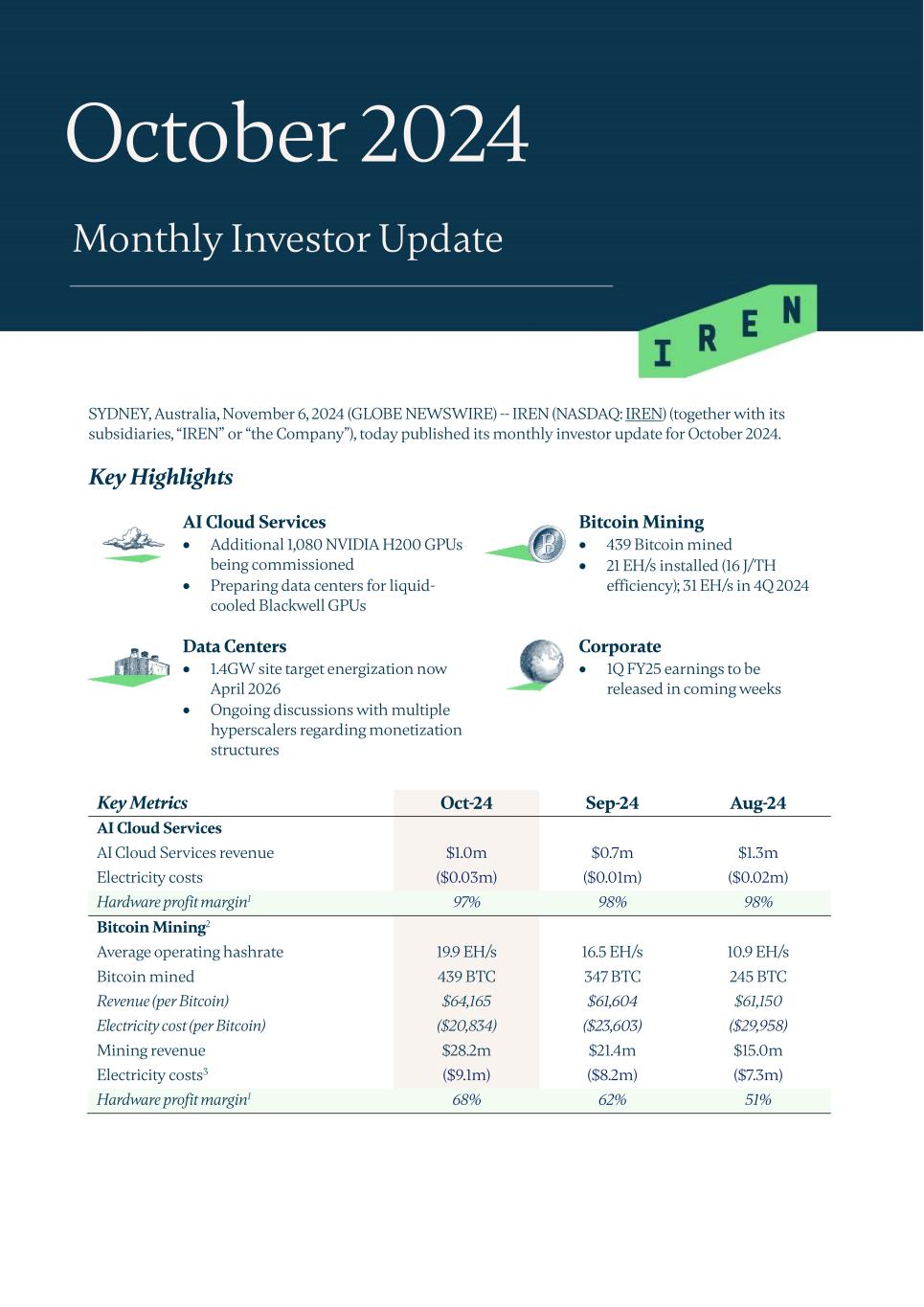 SYDNEY, Australia, November 6, 2024 (GLOBE NEWSWIRE) -- IREN (NASDAQ: IREN) (together with its subsidiaries, “IREN” or “the Company”), today published its monthly investor update for October 2024. Key Highlights AI Cloud Services Bitcoin Mining  Additional 1,080 NVIDIA H200 GPUs being commissioned  Preparing data centers for liquid- cooled Blackwell GPUs  439 Bitcoin mined  21 EH/s installed (16 J/TH efficiency); 31 EH/s in 4Q 2024 Data Centers Corporate  1.4GW site target energization now April 2026  Ongoing discussions with multiple hyperscalers regarding monetization structures  1Q FY25 earnings to be released in coming weeks Key Metrics Oct-24 Sep-24 Aug-24 AI Cloud Services AI Cloud Services revenue $1.0m $0.7m $1.3m Electricity costs ($0.03m) ($0.01m) ($0.02m) Hardware profit margin1 97% 98% 98% Bitcoin Mining2 Average operating hashrate 19.9 EH/s 16.5 EH/s 10.9 EH/s Bitcoin mined 439 BTC 347 BTC 245 BTC Revenue (per Bitcoin) $64,165 $61,604 $61,150 Electricity cost (per Bitcoin) ($20,834) ($23,603) ($29,958) Mining revenue $28.2m $21.4m $15.0m Electricity costs3 ($9.1m) ($8.2m) ($7.3m) Hardware profit margin1 68% 62% 51% October 2024 Monthly Investor Update