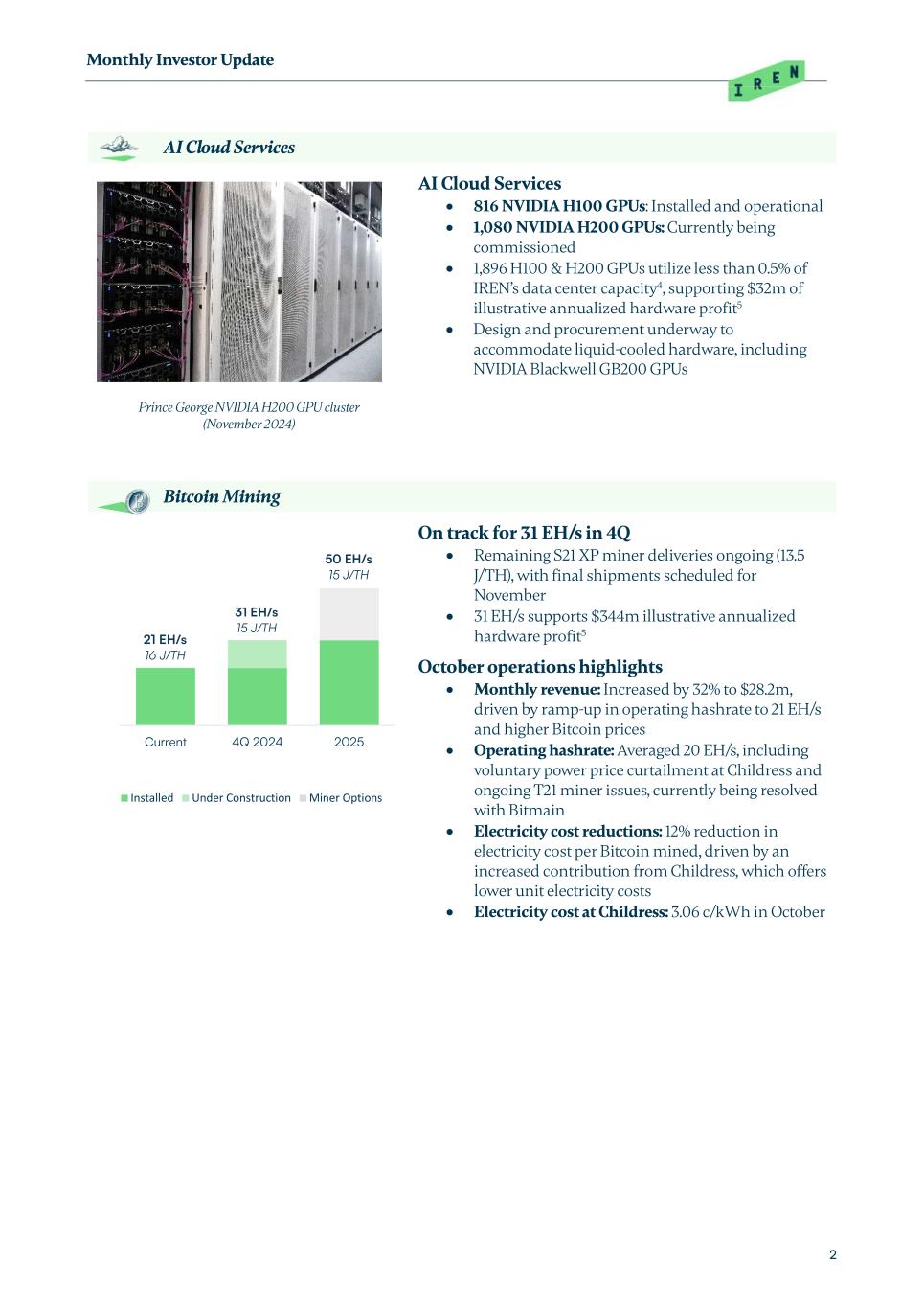 Monthly Investor Update 2 AI Cloud Services Prince George NVIDIA H200 GPU cluster (November 2024) AI Cloud Services  816 NVIDIA H100 GPUs: Installed and operational  1,080 NVIDIA H200 GPUs: Currently being commissioned  1,896 H100 & H200 GPUs utilize less than 0.5% of IREN’s data center capacity4, supporting $32m of illustrative annualized hardware profit5  Design and procurement underway to accommodate liquid-cooled hardware, including NVIDIA Blackwell GB200 GPUs Bitcoin Mining On track for 31 EH/s in 4Q  Remaining S21 XP miner deliveries ongoing (13.5 J/TH), with final shipments scheduled for November  31 EH/s supports $344m illustrative annualized hardware profit5 October operations highlights  Monthly revenue: Increased by 32% to $28.2m, driven by ramp-up in operating hashrate to 21 EH/s and higher Bitcoin prices  Operating hashrate: Averaged 20 EH/s, including voluntary power price curtailment at Childress and ongoing T21 miner issues, currently being resolved with Bitmain  Electricity cost reductions: 12% reduction in electricity cost per Bitcoin mined, driven by an increased contribution from Childress, which offers lower unit electricity costs  Electricity cost at Childress: 3.06 c/kWh in October Current 4Q 2024 2025 Installed Under Construction Miner Options 31 EH/s 15 J/TH 50 EH/s 15 J/TH 21 EH/s 16 J/TH