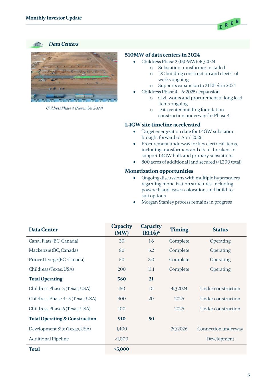 Monthly Investor Update 3 Data Centers Childress Phase 4 (November 2024) 510MW of data centers in 2024  Childress Phase 3 (150MW): 4Q 2024 o Substation transformer installed o DC building construction and electrical works ongoing o Supports expansion to 31 EH/s in 2024  Childress Phase 4 – 6: 2025+ expansion o Civil works and procurement of long lead items ongoing o Data center building foundation construction underway for Phase 4 1.4GW site timeline accelerated  Target energization date for 1.4GW substation brought forward to April 2026  Procurement underway for key electrical items, including transformers and circuit breakers to support 1.4GW bulk and primary substations  800 acres of additional land secured (>1,300 total) Monetization opportunities  Ongoing discussions with multiple hyperscalers regarding monetization structures, including powered land leases, colocation, and build-to- suit options  Morgan Stanley process remains in progress Data Center Capacity (MW) Capacity (EH/s)6 Timing Status Canal Flats (BC, Canada) 30 1.6 Complete Operating Mackenzie (BC, Canada) 80 5.2 Complete Operating Prince George (BC, Canada) 50 3.0 Complete Operating Childress (Texas, USA) 200 11.1 Complete Operating Total Operating 360 21 Childress Phase 3 (Texas, USA) 150 10 4Q 2024 Under construction Childress Phase 4 - 5 (Texas, USA) 300 20 2025 Under construction Childress Phase 6 (Texas, USA) 100 2025 Under construction Total Operating & Construction 910 50 Development Site (Texas, USA) 1,400 2Q 2026 Connection underway Additional Pipeline >1,000 Development Total >3,000