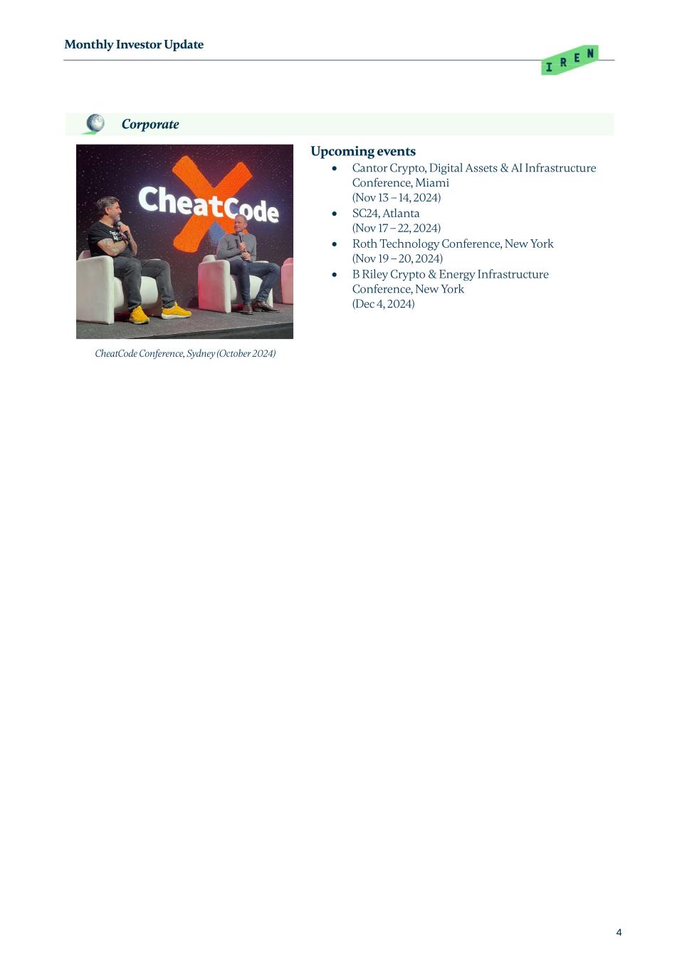 Monthly Investor Update 4 Corporate CheatCode Conference, Sydney (October 2024) Upcoming events  Cantor Crypto, Digital Assets & AI Infrastructure Conference, Miami (Nov 13 – 14, 2024)  SC24, Atlanta (Nov 17 – 22, 2024)  Roth Technology Conference, New York (Nov 19 – 20, 2024)  B Riley Crypto & Energy Infrastructure Conference, New York (Dec 4, 2024)